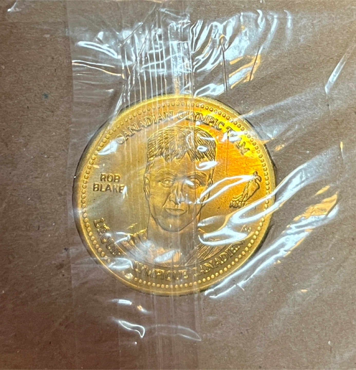 Coca-Cola 2002 commemorative coin featuring the Canadian Olympic Team and Rob Blake. It's gold-toned metal with Olympic rings and a maple leaf design. Still in its original packaging.