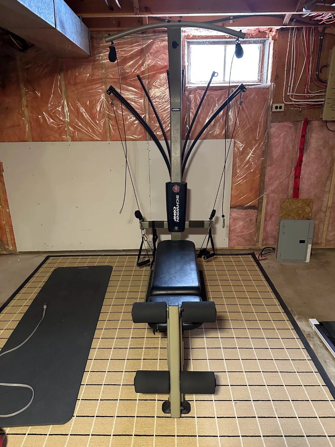 Schwinn Comp Power Tower fitness station. It's a versatile piece of home gym equipment with a weight bench and multiple exercise stations. Sturdy metal frame with padded bench.