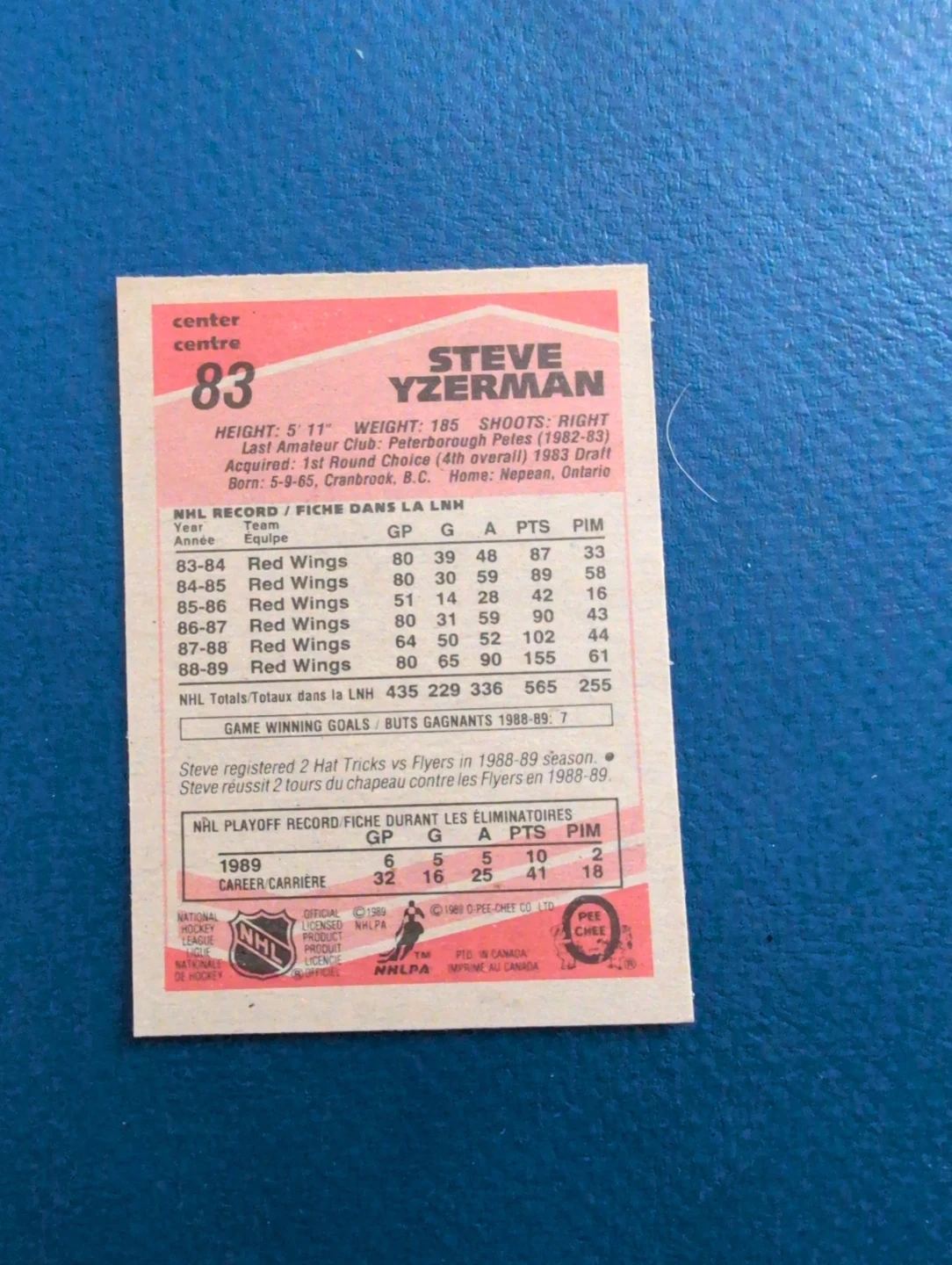 This is a 1989-90 O-Pee-Chee hockey card featuring Steve Yzerman of the Detroit Red Wings. It includes his career statistics from the 1988-89 season. Card is in a protective sleeve.