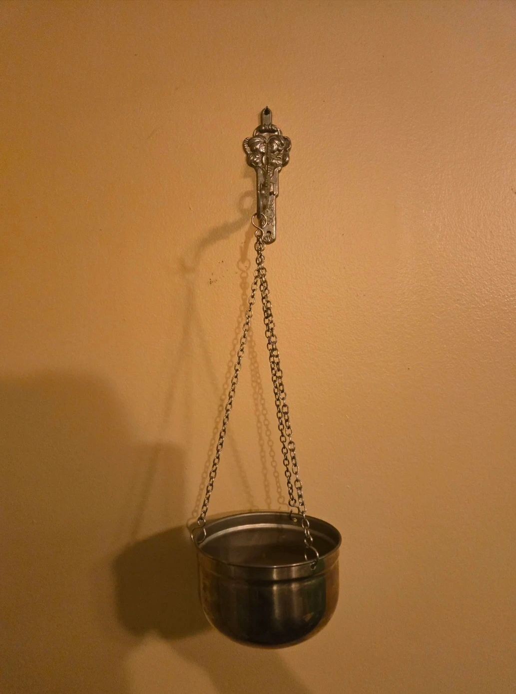 This is a vintage hanging censer, also known as a thurible, complete with its original metal chain. It's made of metal and features a decorative wall mount. This item would be useful for religious ceremonies or for home use with incense.