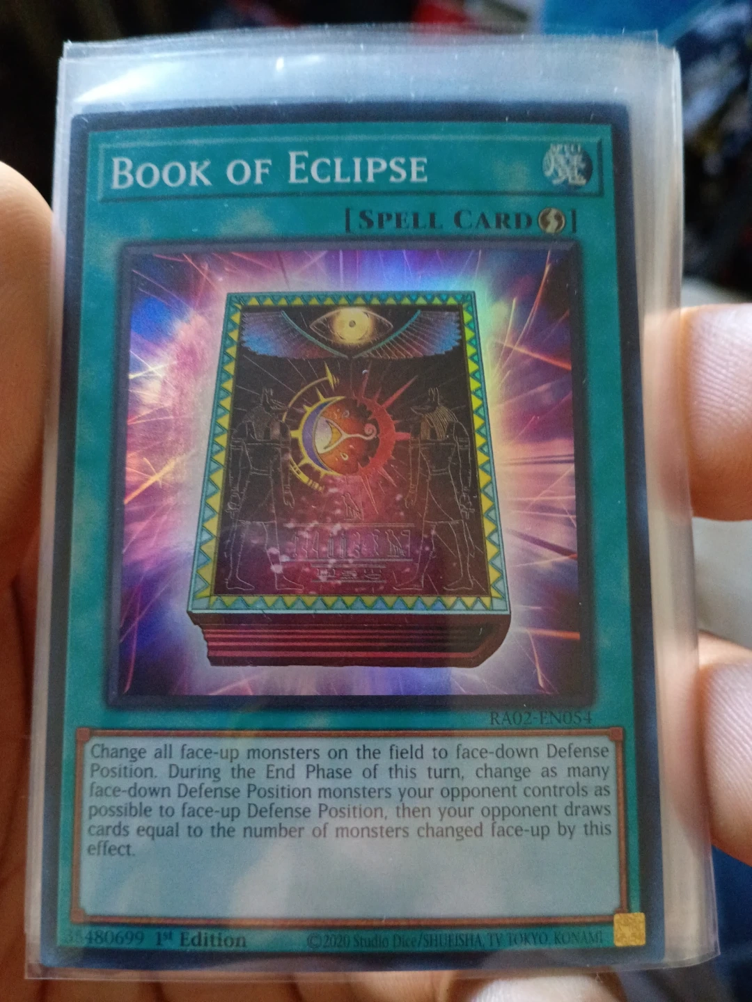 This is the Yu-Gi-Oh! Book of Eclipse spell card. It's a 1st Edition card from 2020. The card text details its effect on monsters during the game.