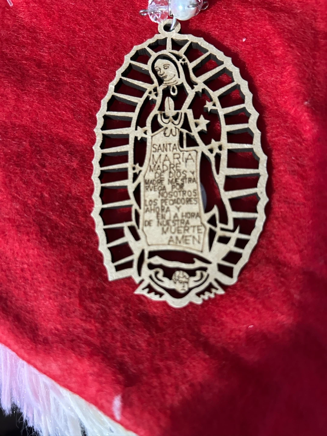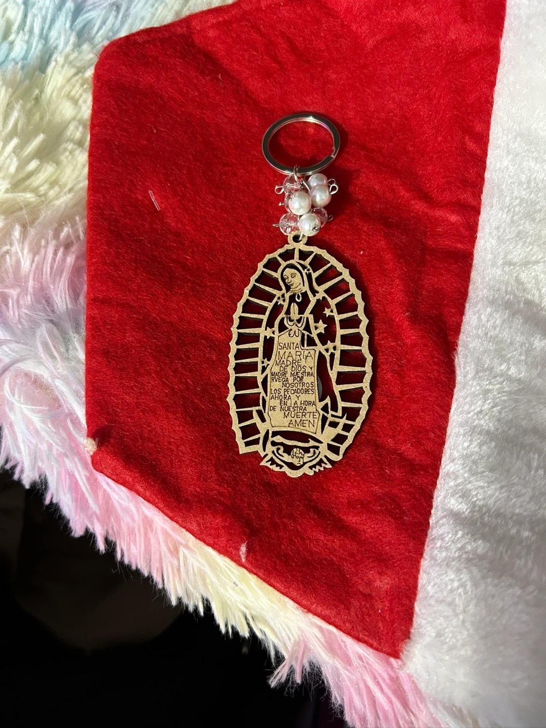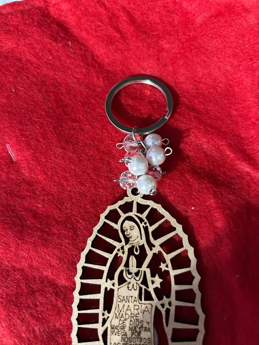 Here's a keychain featuring the Virgin Mary. It's in great condition and has a unique design with pearl-like beads. Perfect for adding a personal touch to your keys or bag!