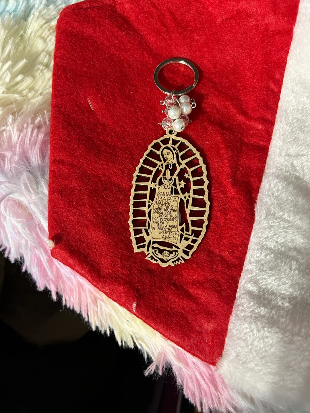 Here's a keychain featuring the Virgin Mary. It's in great condition and has a unique design with pearl-like beads. Perfect for adding a personal touch to your keys or bag!