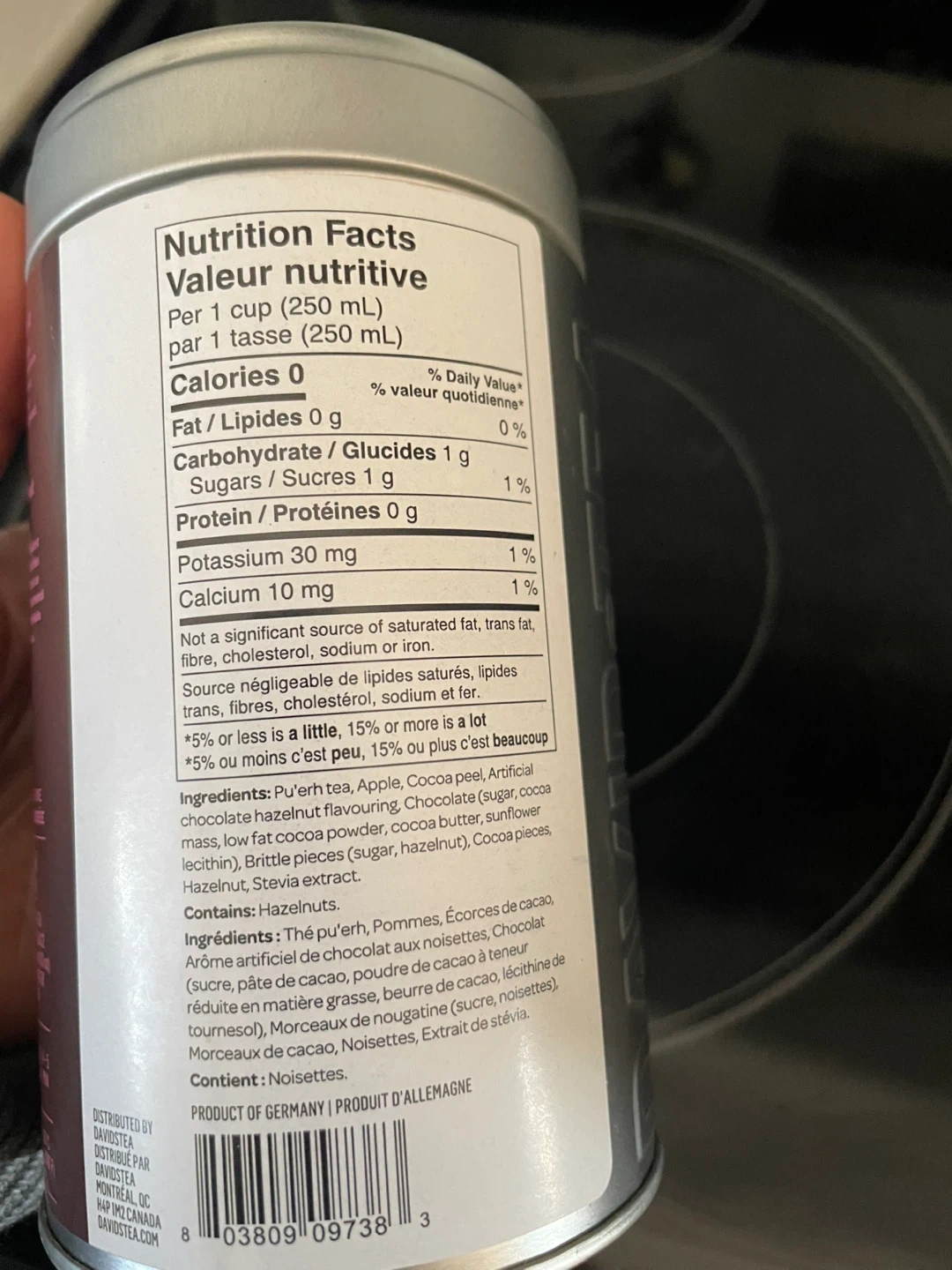 A rich, chocolatey, and nutty loose leaf tea blend. Ingredients include Pu'erh tea, apple, cocoa peel, artificial chocolate hazelnut flavouring, sugar, sunflower lecithin, brittle pieces, cocoa pieces, and stevia extract. Contains hazelnuts.