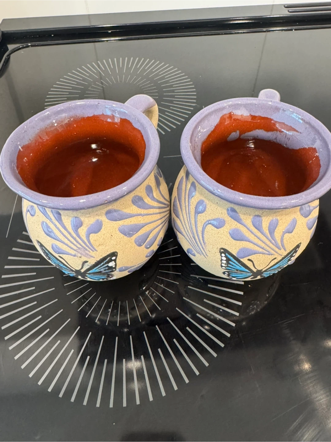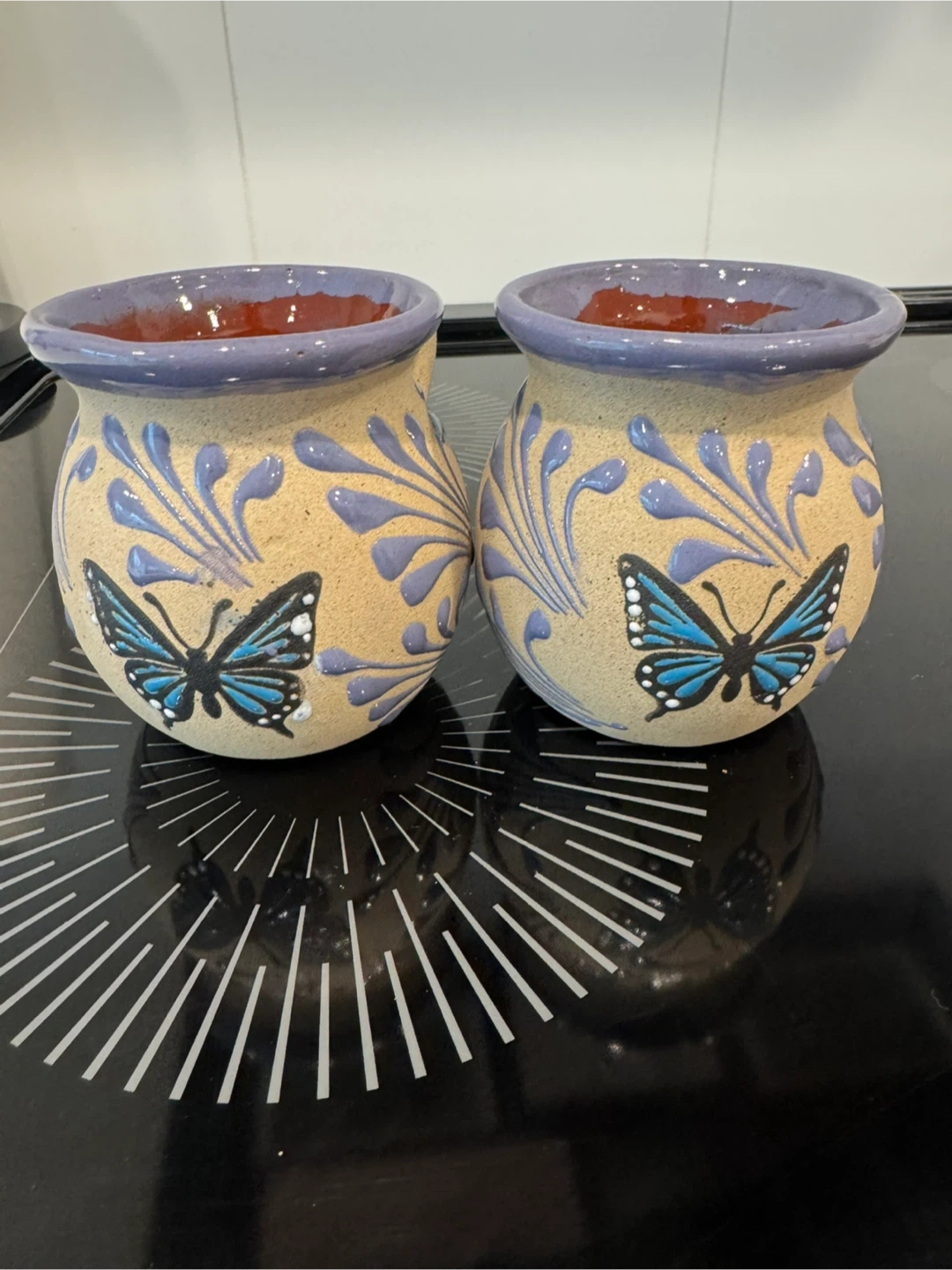 Two decorative ceramic mugs featuring a lovely butterfly and floral design. Perfect for enjoying your morning coffee or tea!