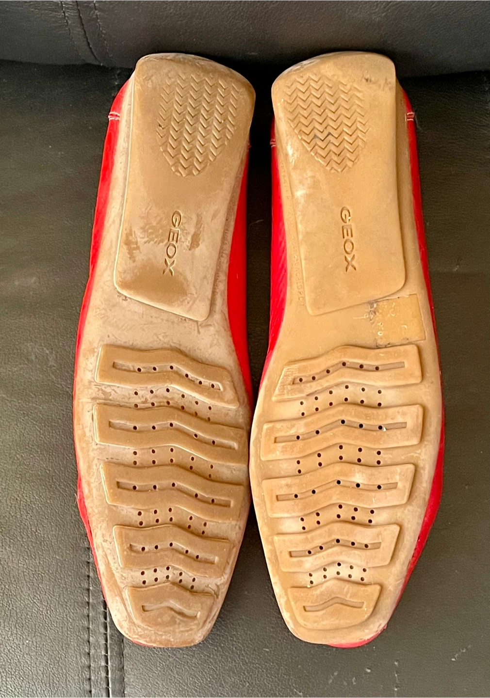 Geox leather loafers in red. Size is 36. They're a slip-on style with decorative knot detail. These shoes are great for everyday wear! Very good condition.