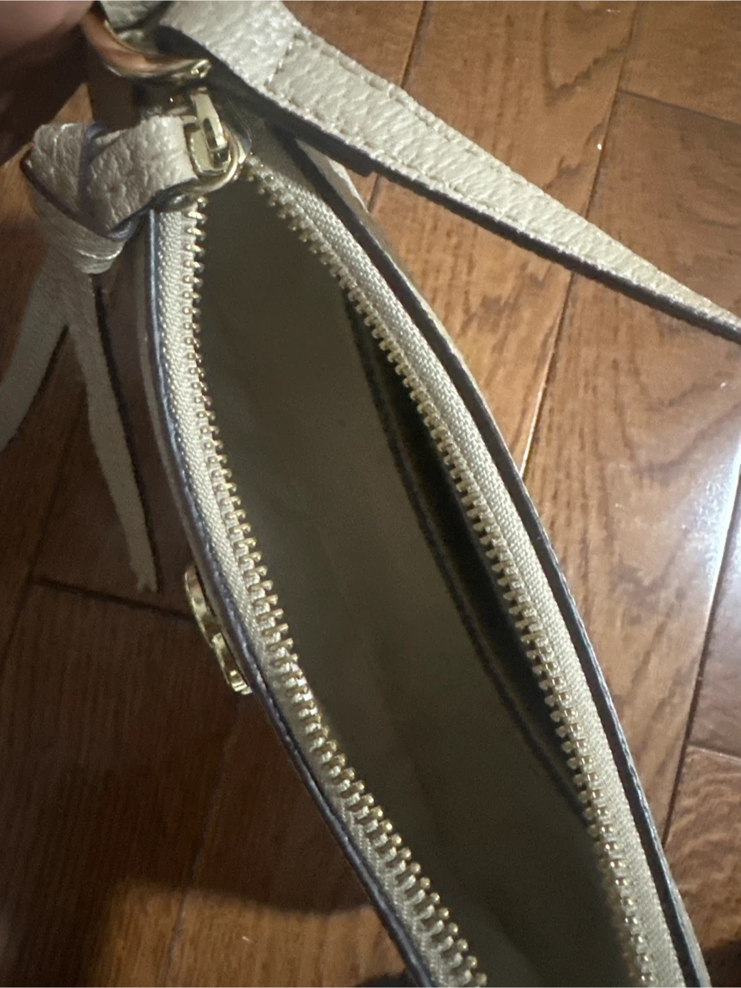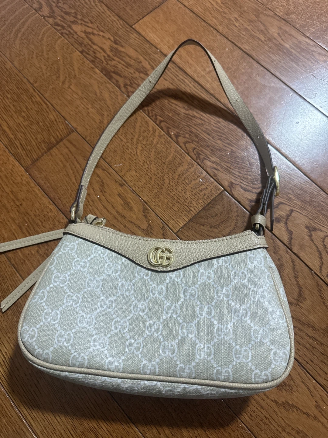 A beige and white Gucci shoulder bag with the signature GG monogram pattern. It features a top zipper closure and a single strap. This bag is perfect for everyday use. can meet whitby, oshawa, bowmanville or scarborough