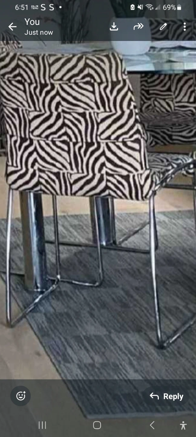 Stylish dining chair featuring a bold zebra print upholstered seat and back. It has a sturdy chrome metal frame for durability. This chair adds a pop of personality to any dining space!