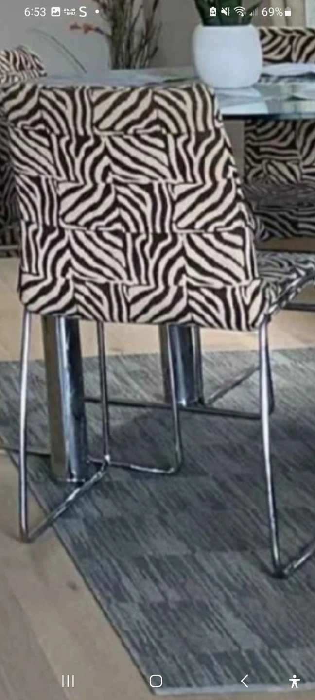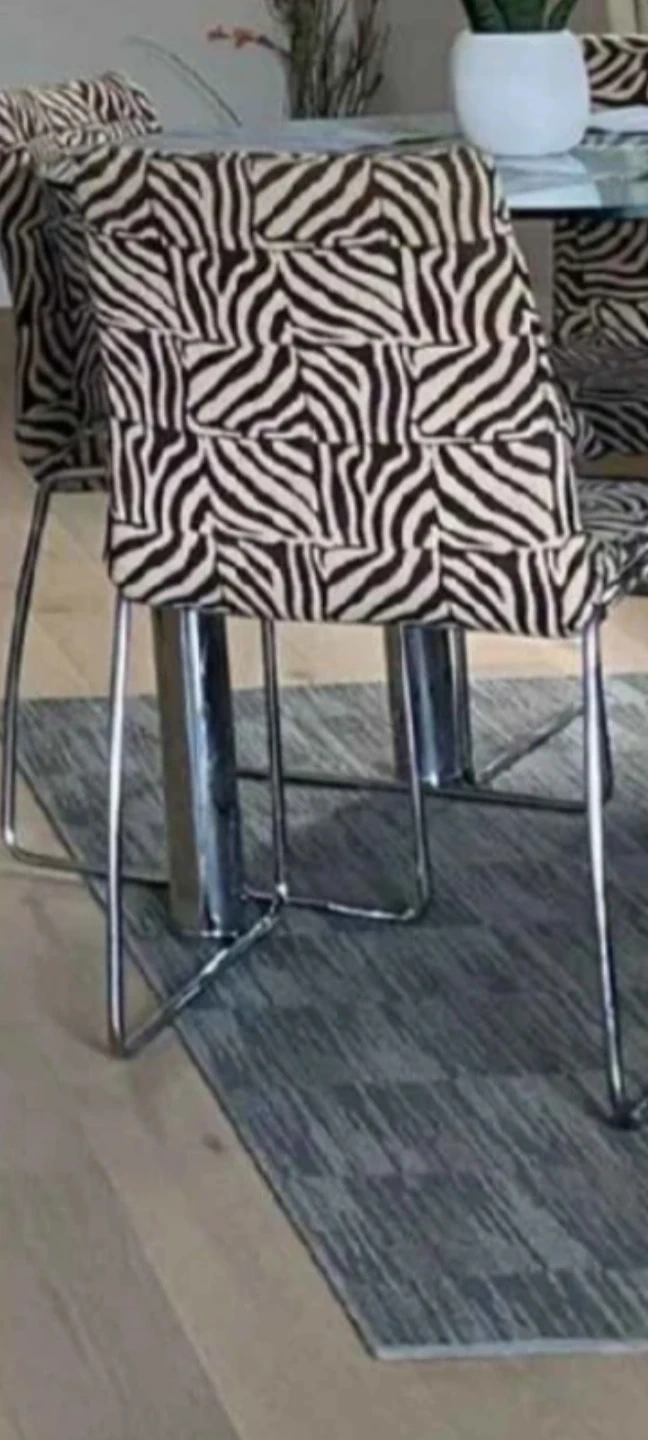 Stylish dining chair featuring a bold zebra print upholstered seat and back. It has a sturdy chrome metal frame for durability. This chair adds a pop of personality to any dining space!