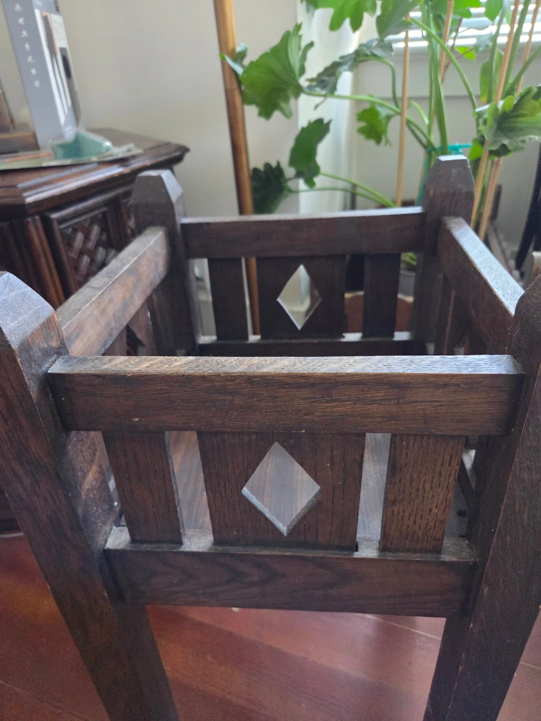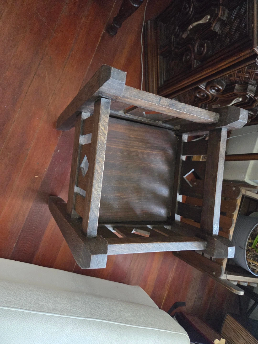 This is a sturdy wooden plant stand or small stool. It's made of dark-stained wood with decorative cutouts. It would look great holding a potted plant or as an extra seat.