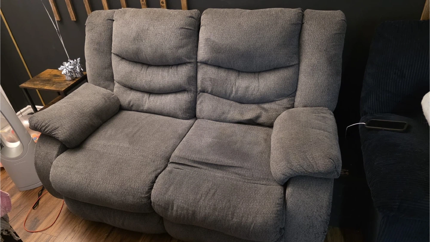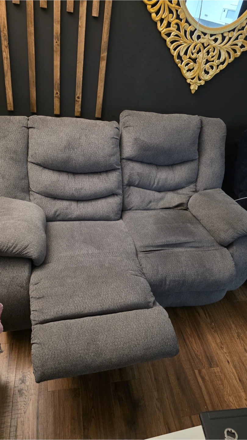 Grey fabric double recliner loveseat. Both sides recline for comfort. It's in good condition with some minor wear spots. This loveseat offers a cozy spot for two!