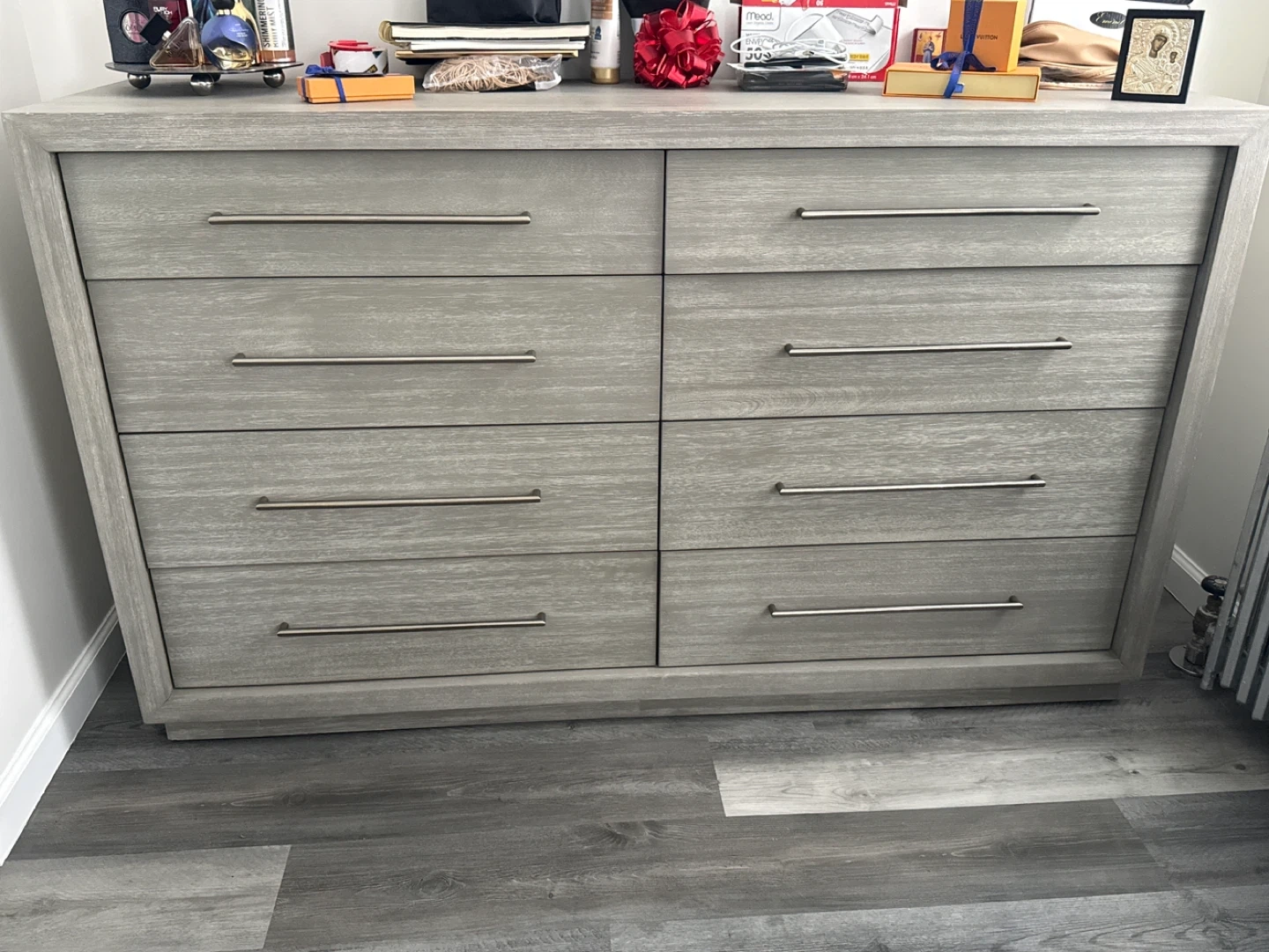 This dresser features a grey wood finish with sleek silver handles. It has eight spacious drawers for ample storage. It's a great piece for a bedroom