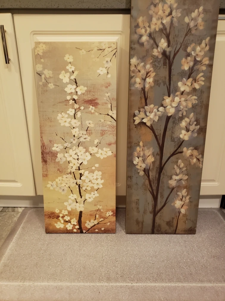 Two framed canvas prints featuring floral trees. One is 12x30 inches, the other is 12x36 inches. The frames are wood.