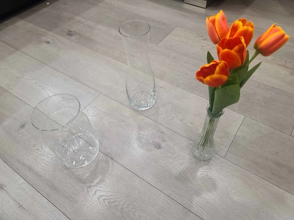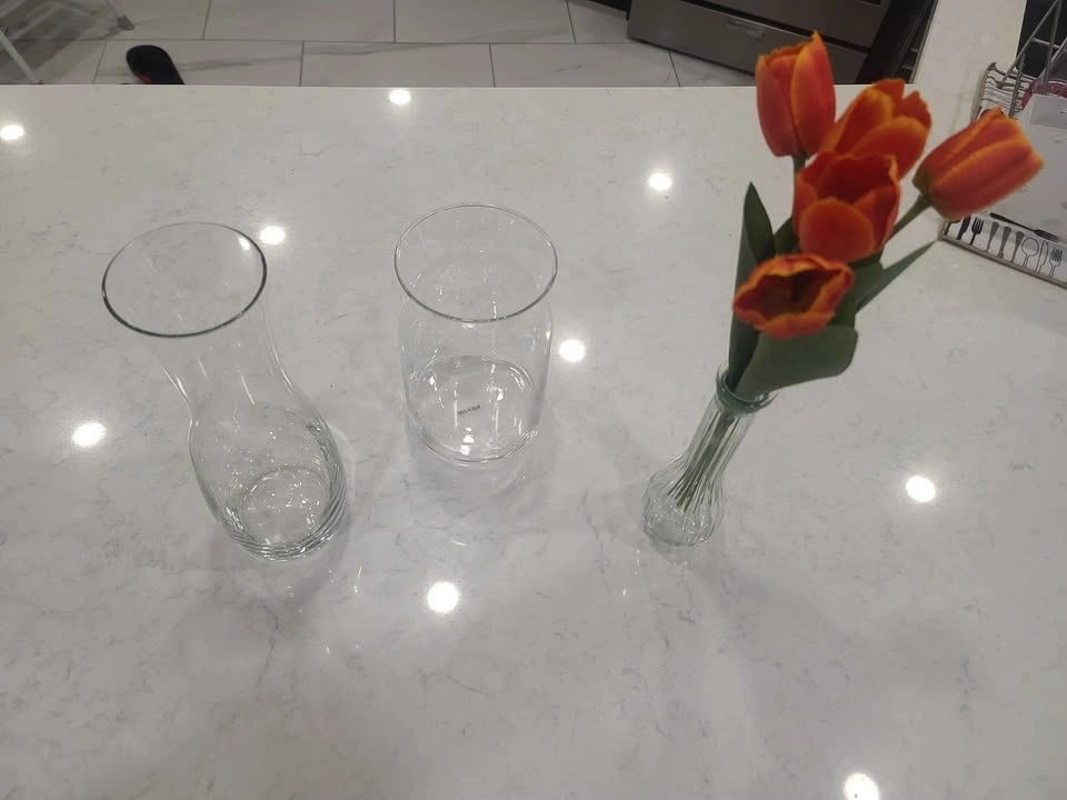 Selling a set of 3 clear glass pieces that can be used as vases or decorative containers. Includes: 1 tall glass jug / carafe, 1 wide glass vase, and 1 small decorative glass vase. Perfect for flowers, home decor, table centerpieces, or serving water/juice. Condition is good, clean, and well maintained.