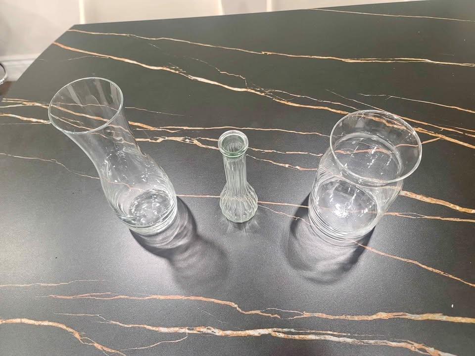 Selling a set of 3 clear glass pieces that can be used as vases or decorative containers. Includes: 1 tall glass jug / carafe, 1 wide glass vase, and 1 small decorative glass vase. Perfect for flowers, home decor, table centerpieces, or serving water/juice. Condition is good, clean, and well maintained.