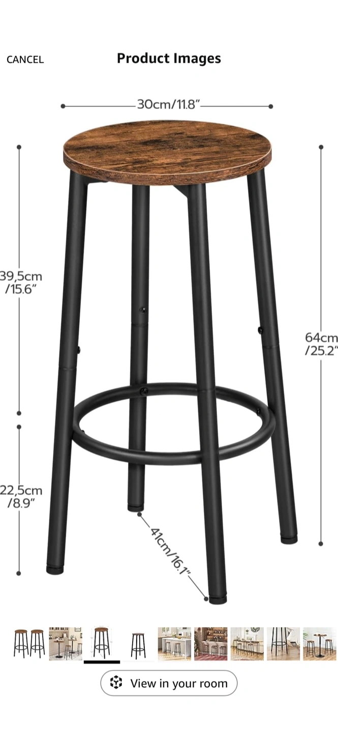 These bar stools feature a round wooden seat and sturdy steel frame with a footrest. Seat diameter is 30cm/11.8", and height is 64cm/25.2". They're perfect for a kitchen counter or breakfast bar.