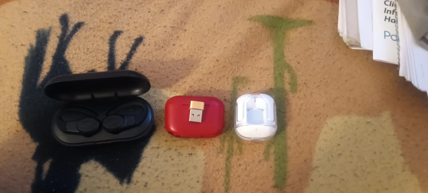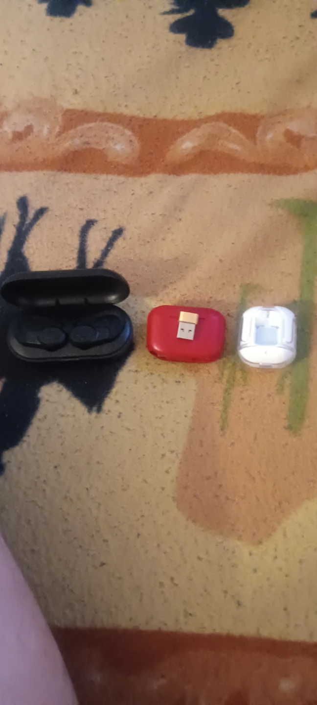 Black wireless earbuds come with a charging case and a USB dongle. They are a convenient option for listening to audio on the go. Case has a red exterior with a gold USB connector.