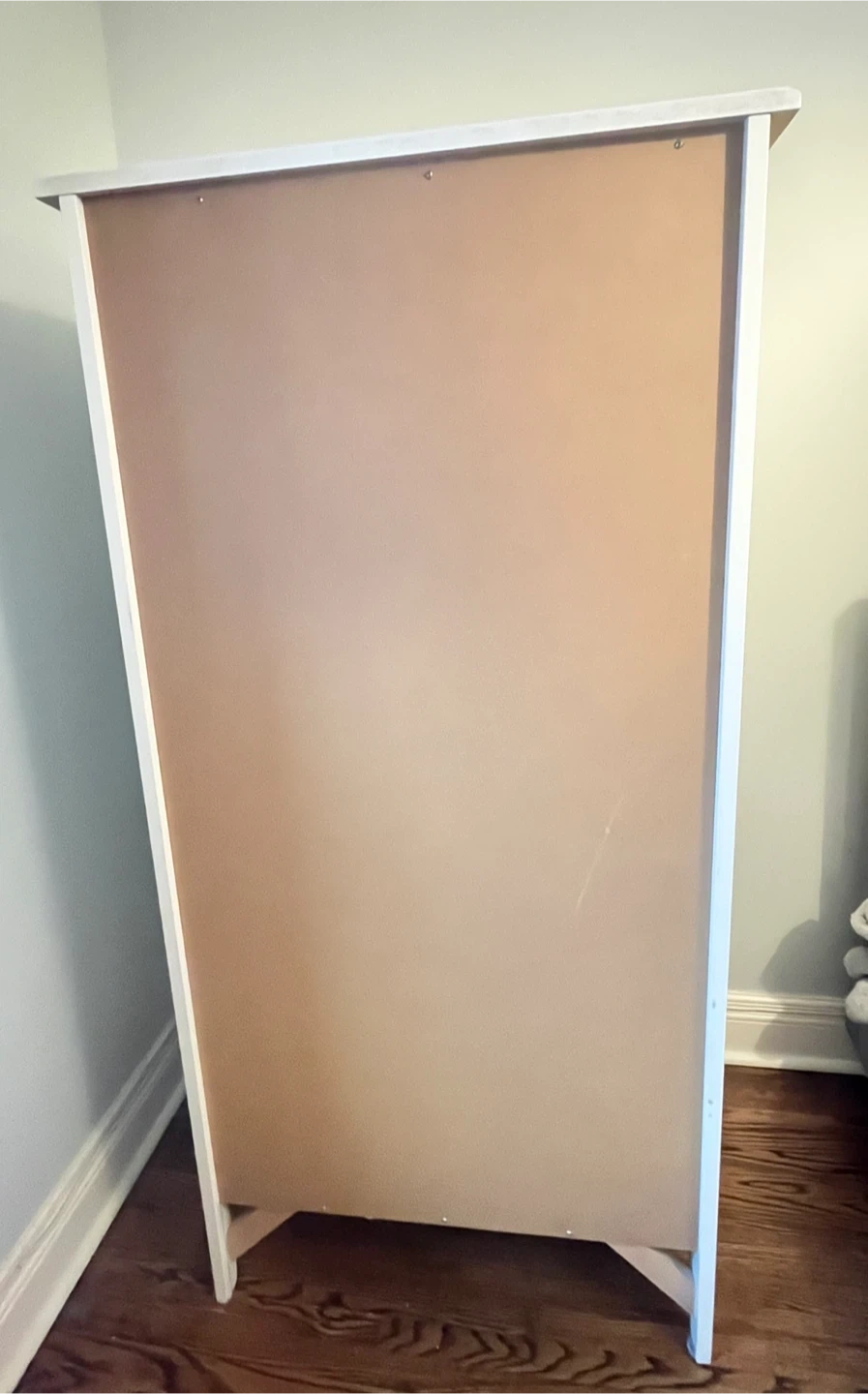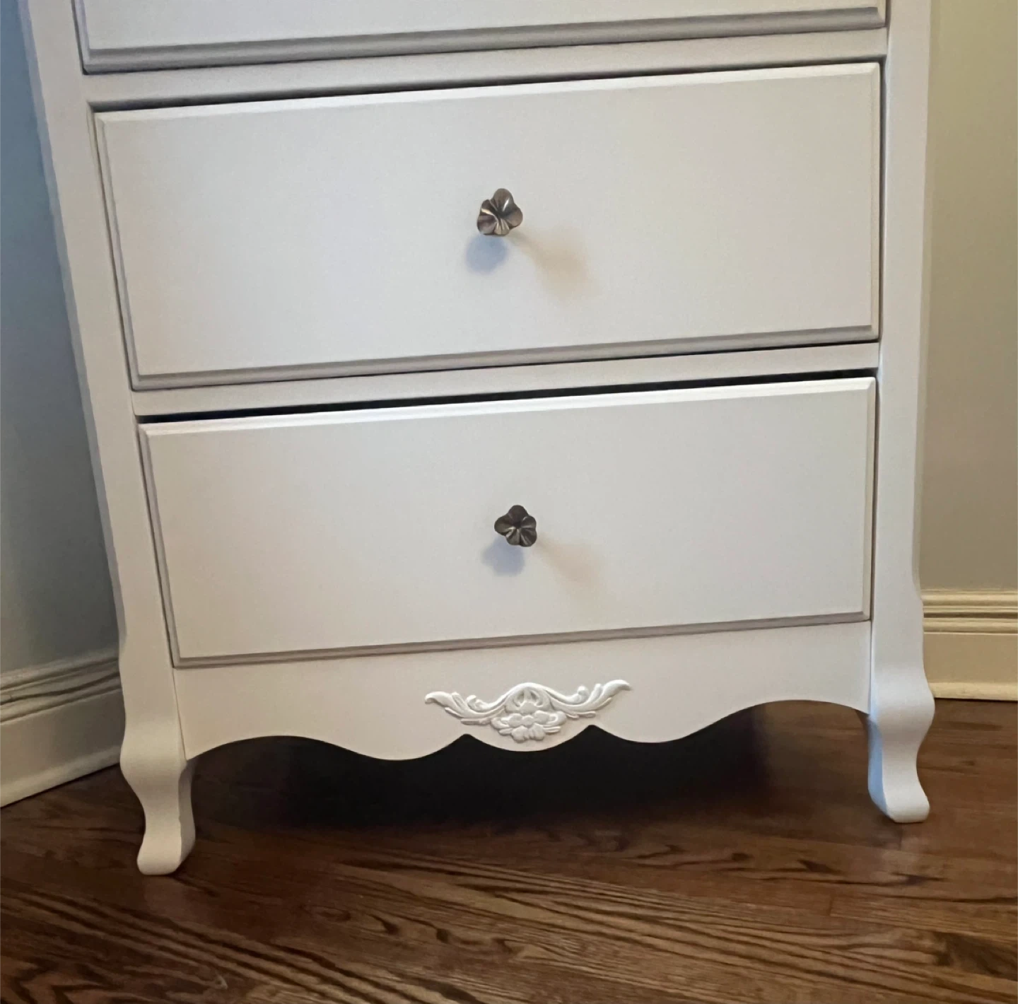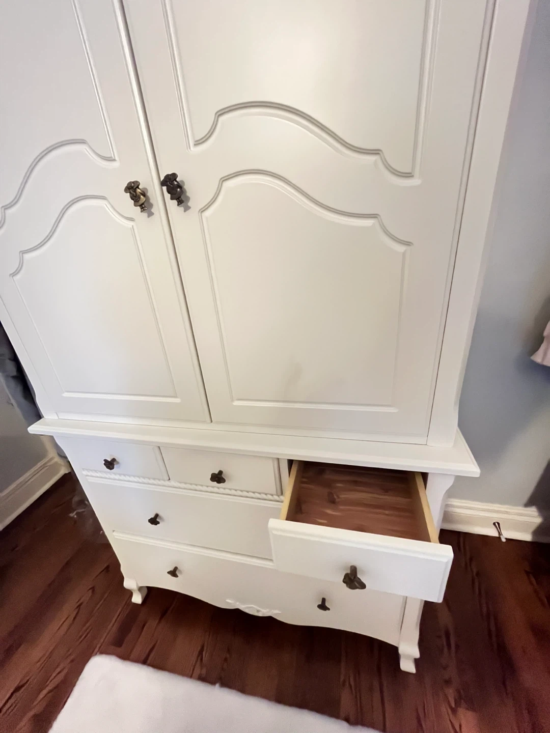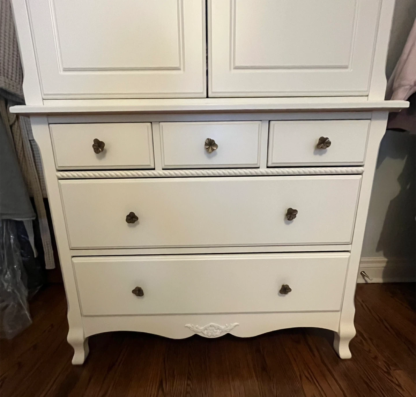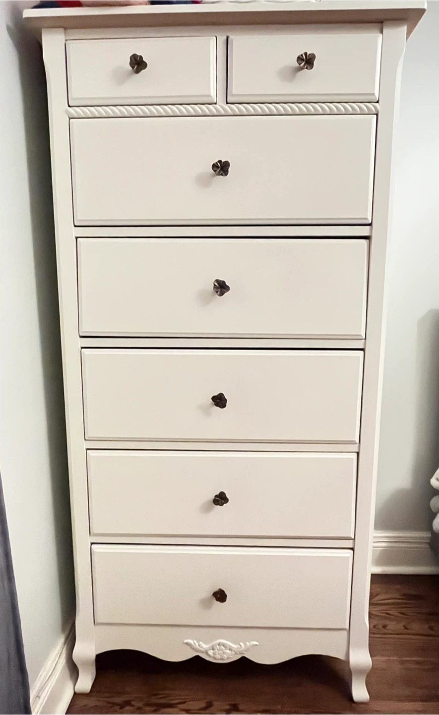 Antique white tall dresser and armoire from Natart Juvenile, a division of Natart Furniture. Would complement any juniors bedroom. The tall dresser has seven drawers with decorative floral pulls. Measures 60 ”Hx30”Dx21”D