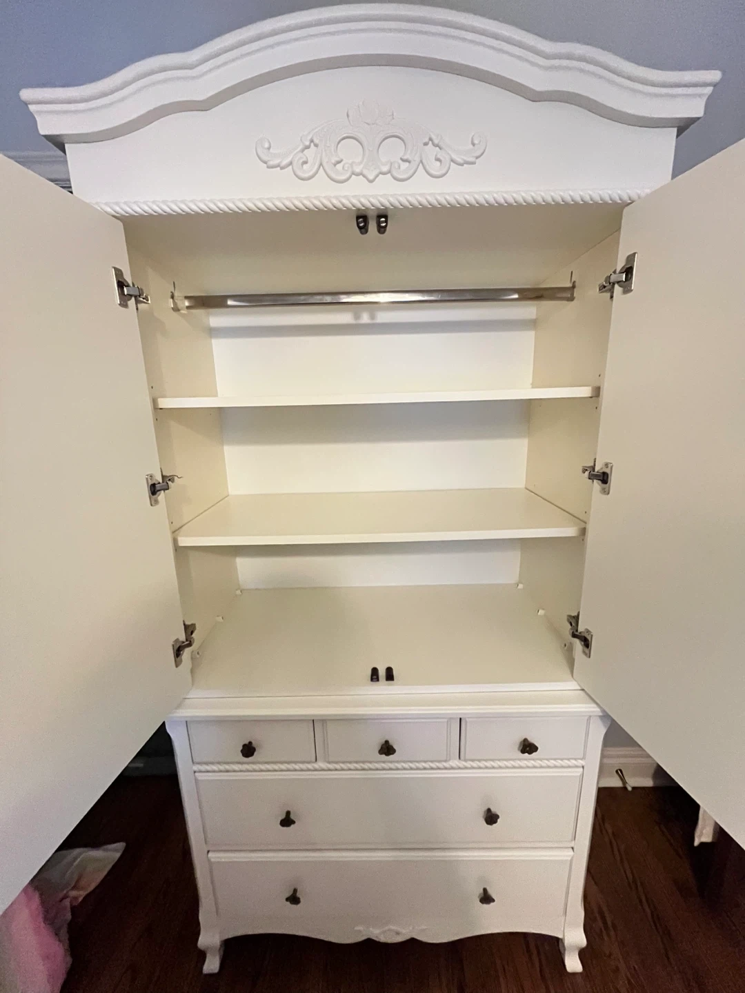 The armoire features upper two shelves/hanger option.