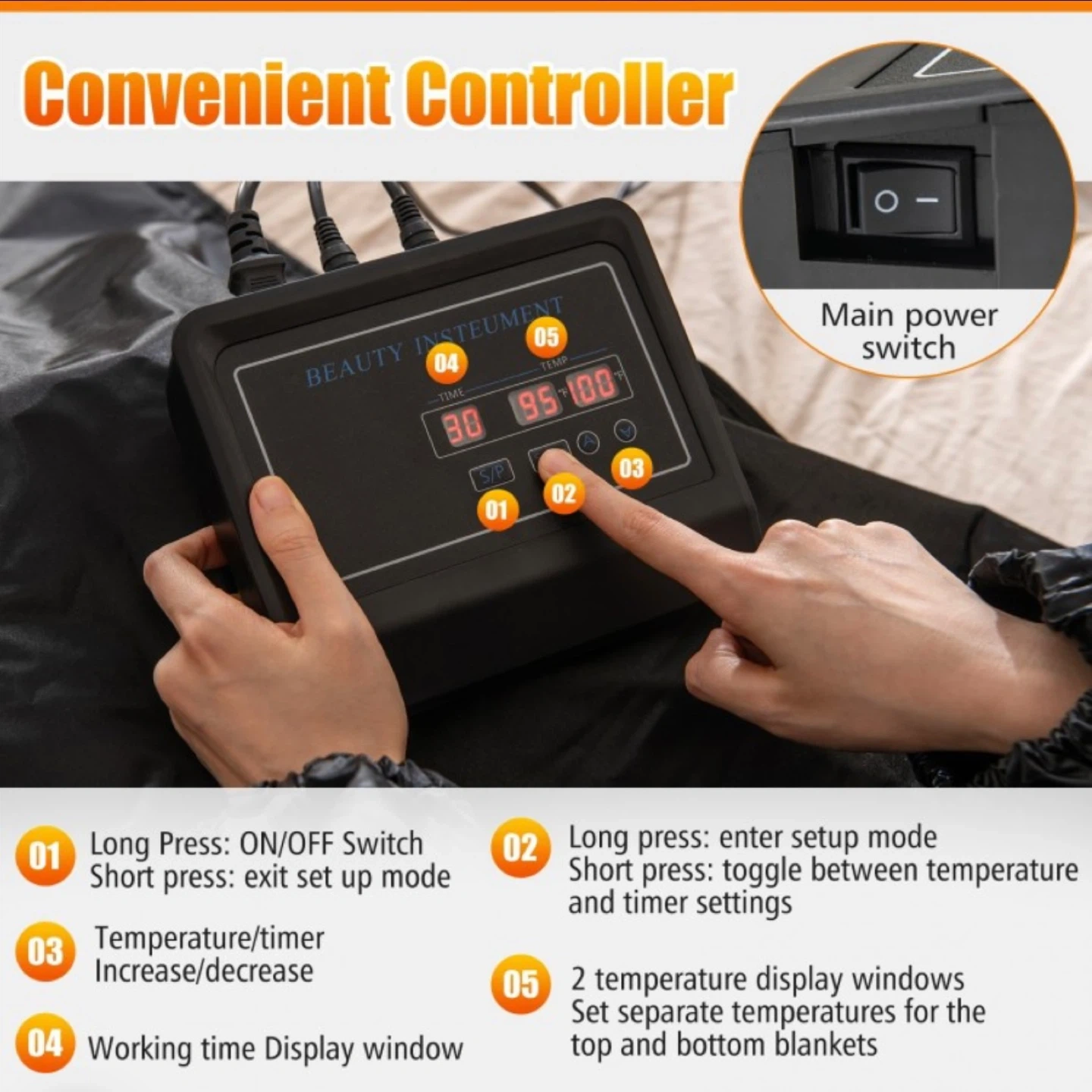 This portable infrared sauna blanket comes with a convenient controller and a carrying bag. It's made from satin cloth, PVC, Oxford cloth, and cotton with heating wires. The timer settings range from 30-90 minutes and temperature from 90-180°F.