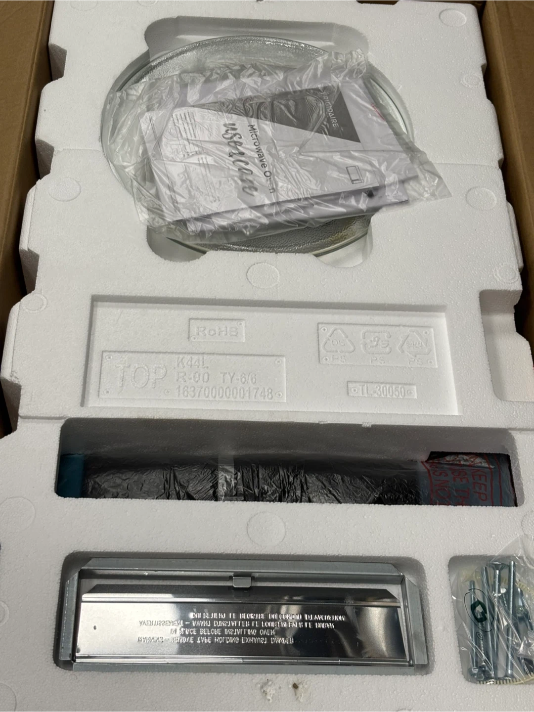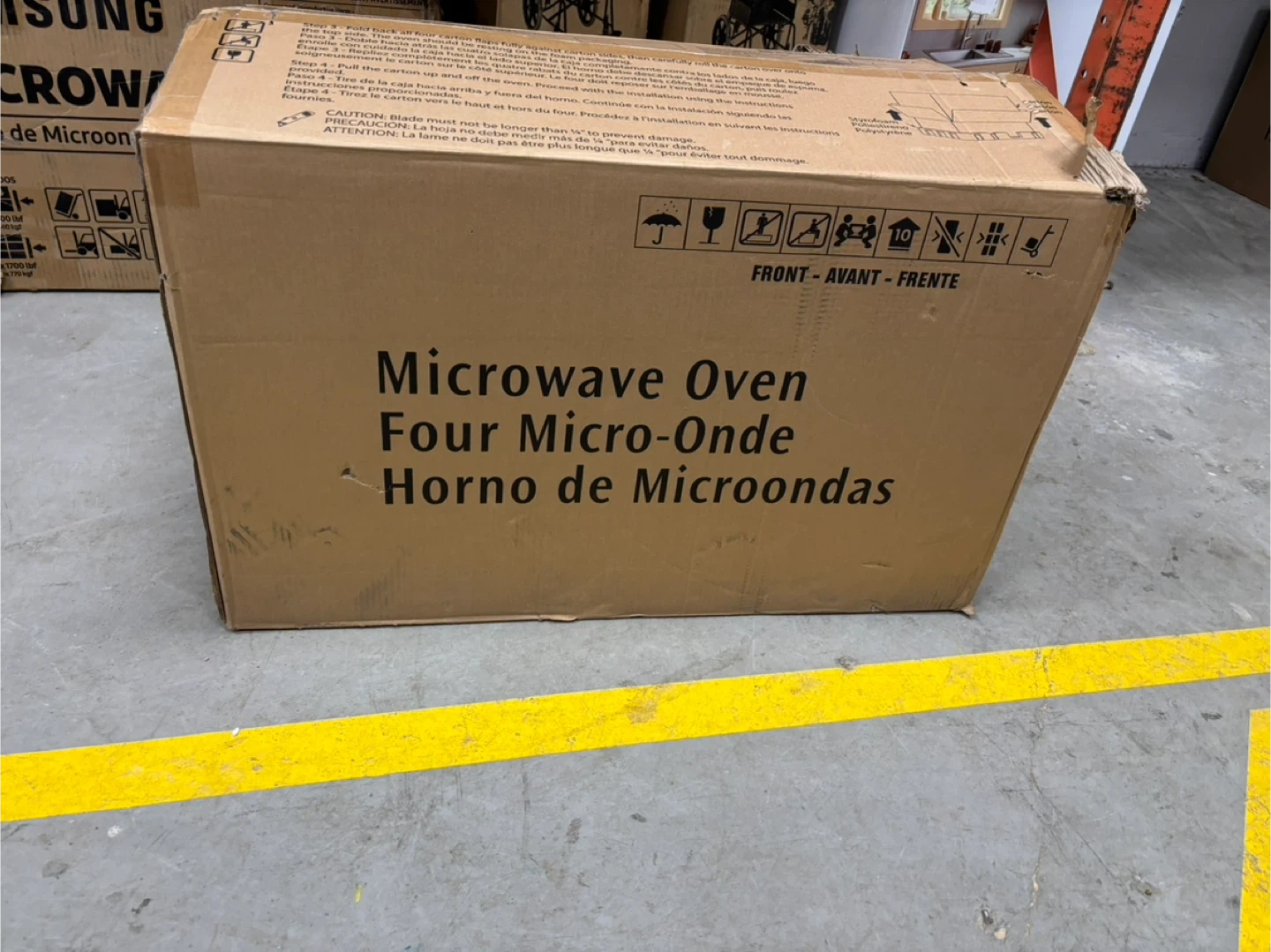 This is a new Frigidaire microwave oven. It features a glass turntable and comes with an over-the-range mounting kit. Pre-programmed settings include popcorn, potato, and sensor cook.