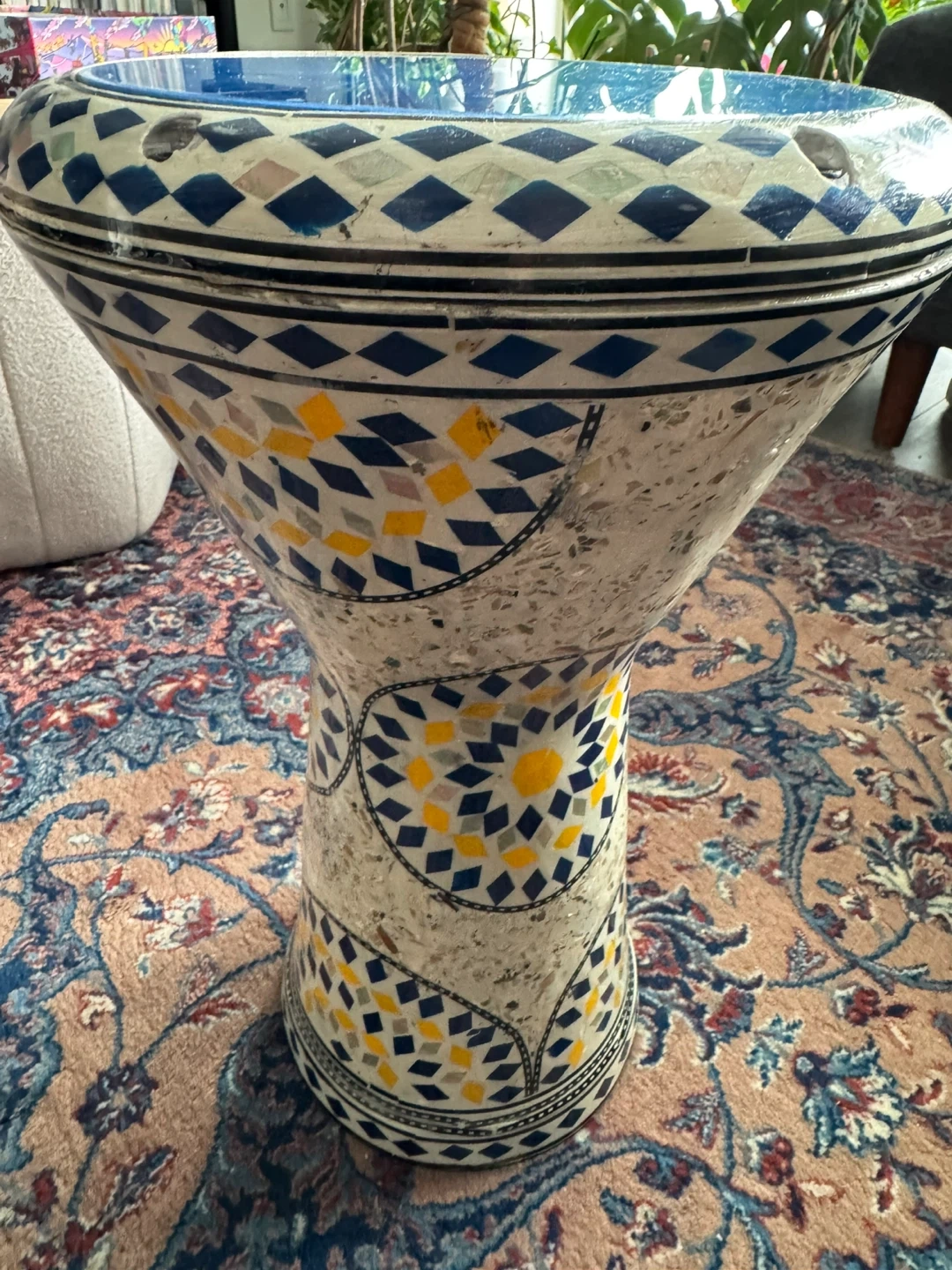 This decorative drum features a colourful mosaic design with blue, yellow, and silver tiles. It measures 42 cm in height and 26 cm in diameter. It's a unique piece for home decor or as a musical instrument if you’re willing to learn.