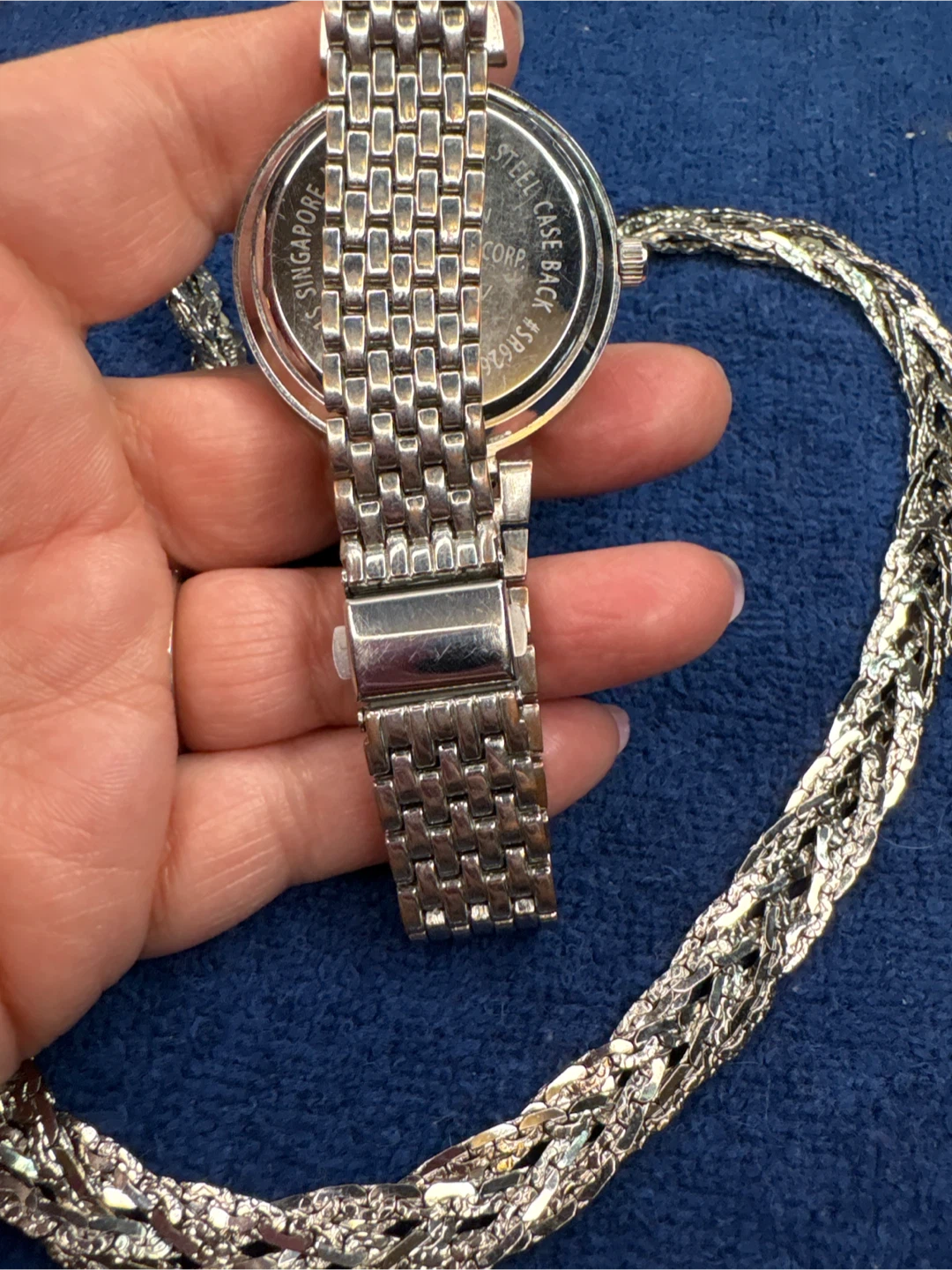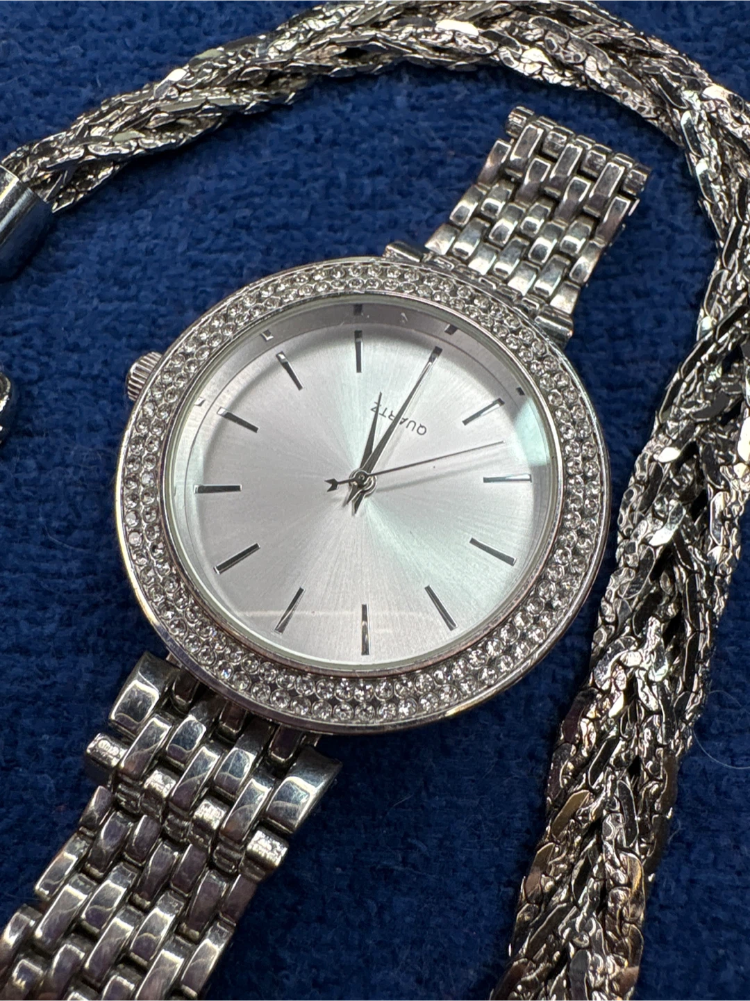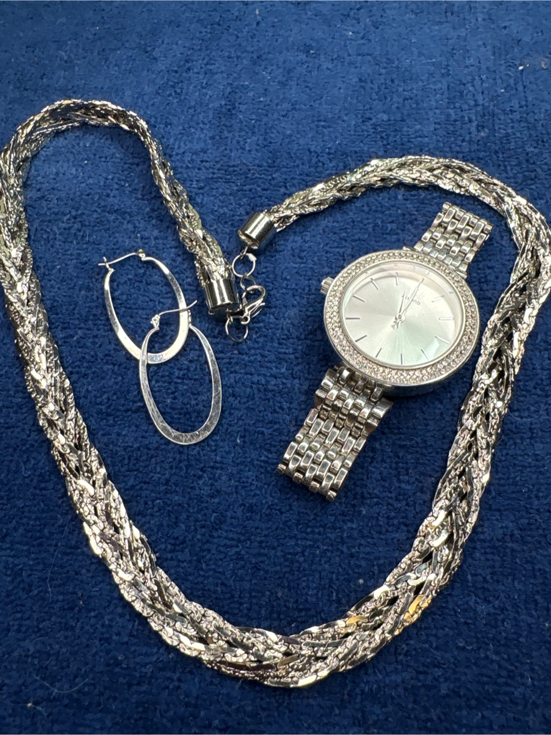 This is a stylish silver-tone Singapore Movement watch with a crystal-embellished bezel and a stainless steel braided necklace that is 22 inches long. It includes a pair of oval silver tone hoop earrings. The watch features a quartz movement and a stainless steel case back. Perfect for adding a touch of sparkle to any outfit!