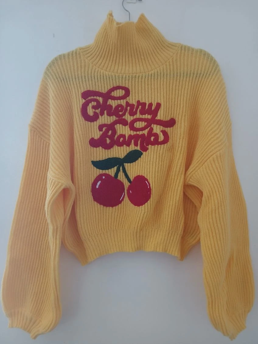 This yellow sweater features a fun "Cherry Bomb" graphic with embroidered cherries. It has a mock neck and ribbed detailing.