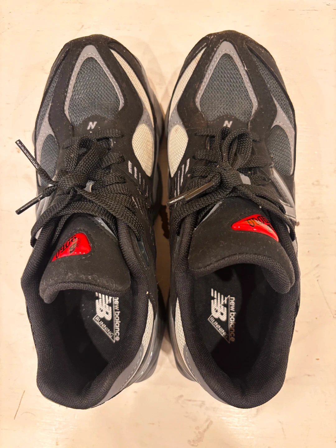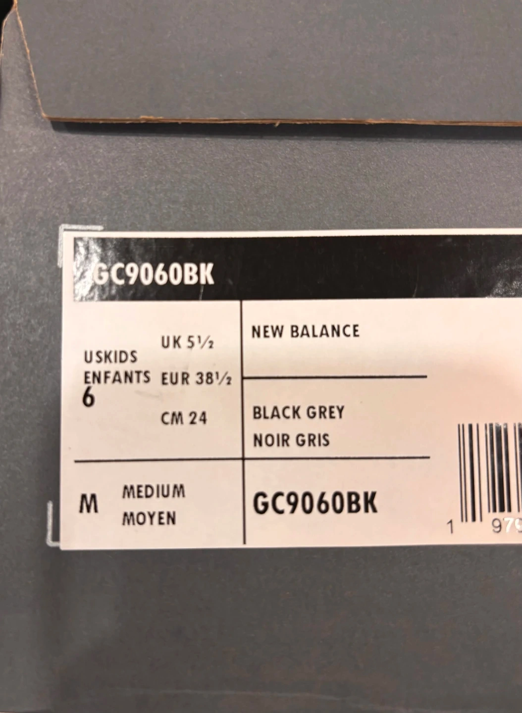 New Balance GC9060BK running shoes in black and grey. Youth size 6, with EUR 38.5 and CM 24. Includes original box.