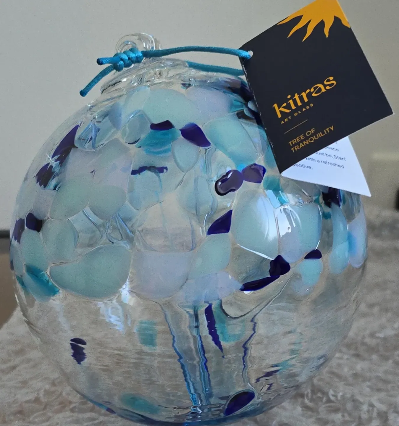 Kitras art glass ornament in the 'Tree of Tranquility' design. Features a clear glass orb with embedded blue and white glass pieces. Includes original tag and hanging cord.