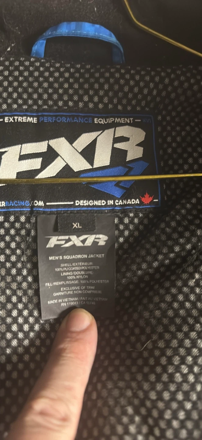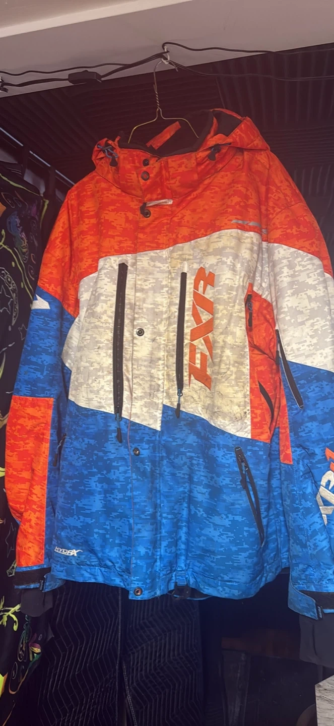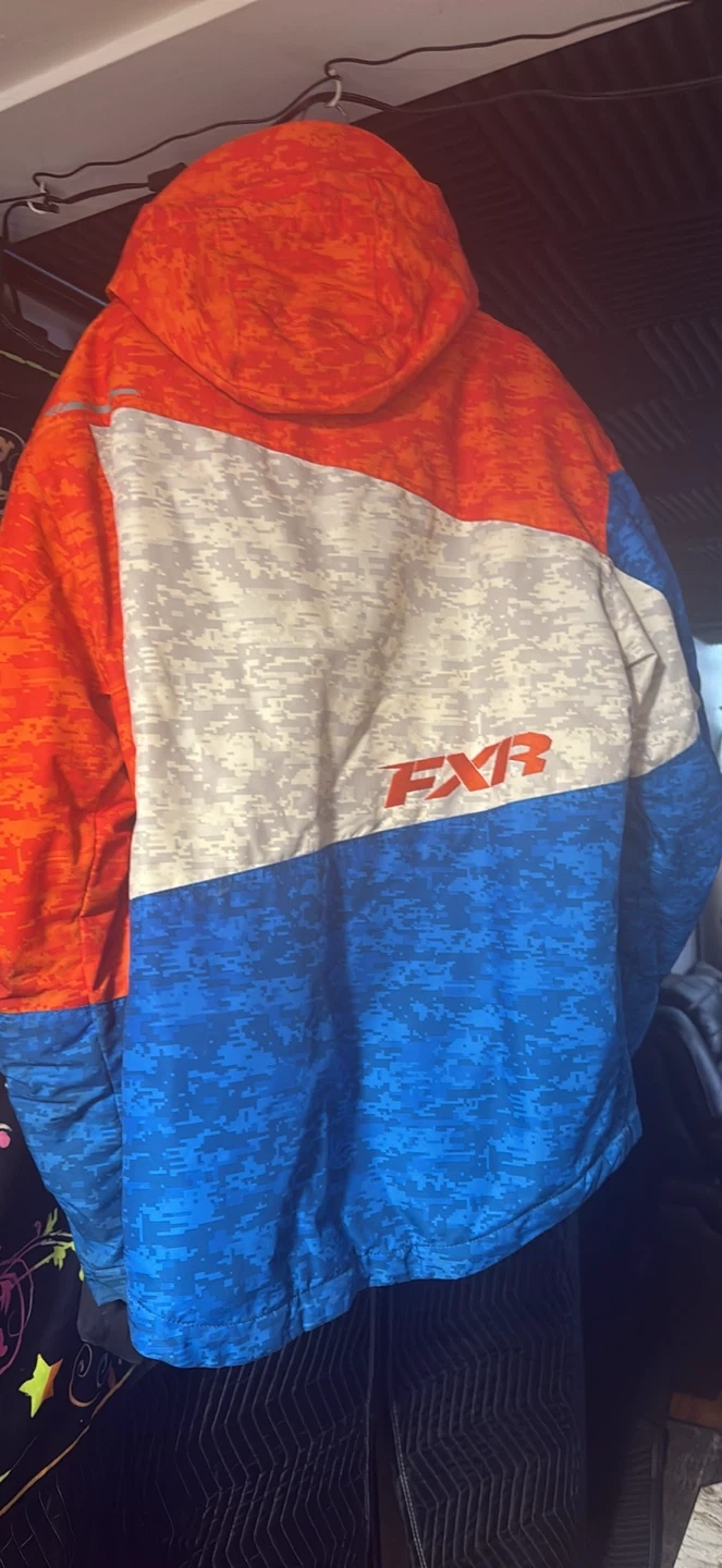 This is an FXR Men's Squadron Jacket in size XL. It's a shell/exterior made of 100% polyester with a DWR coating and 100% nylon fill. The jacket has a blue, white, and orange digital camouflage pattern. There's a tear on the lower front of the jacket, as shown in the photos.