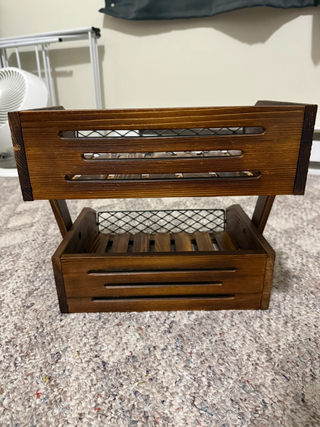 This two-tier basket stand is perfect for organizing fruits or vegetables in your kitchen. It's made of wood with black wire mesh accents. Great for countertop storage!