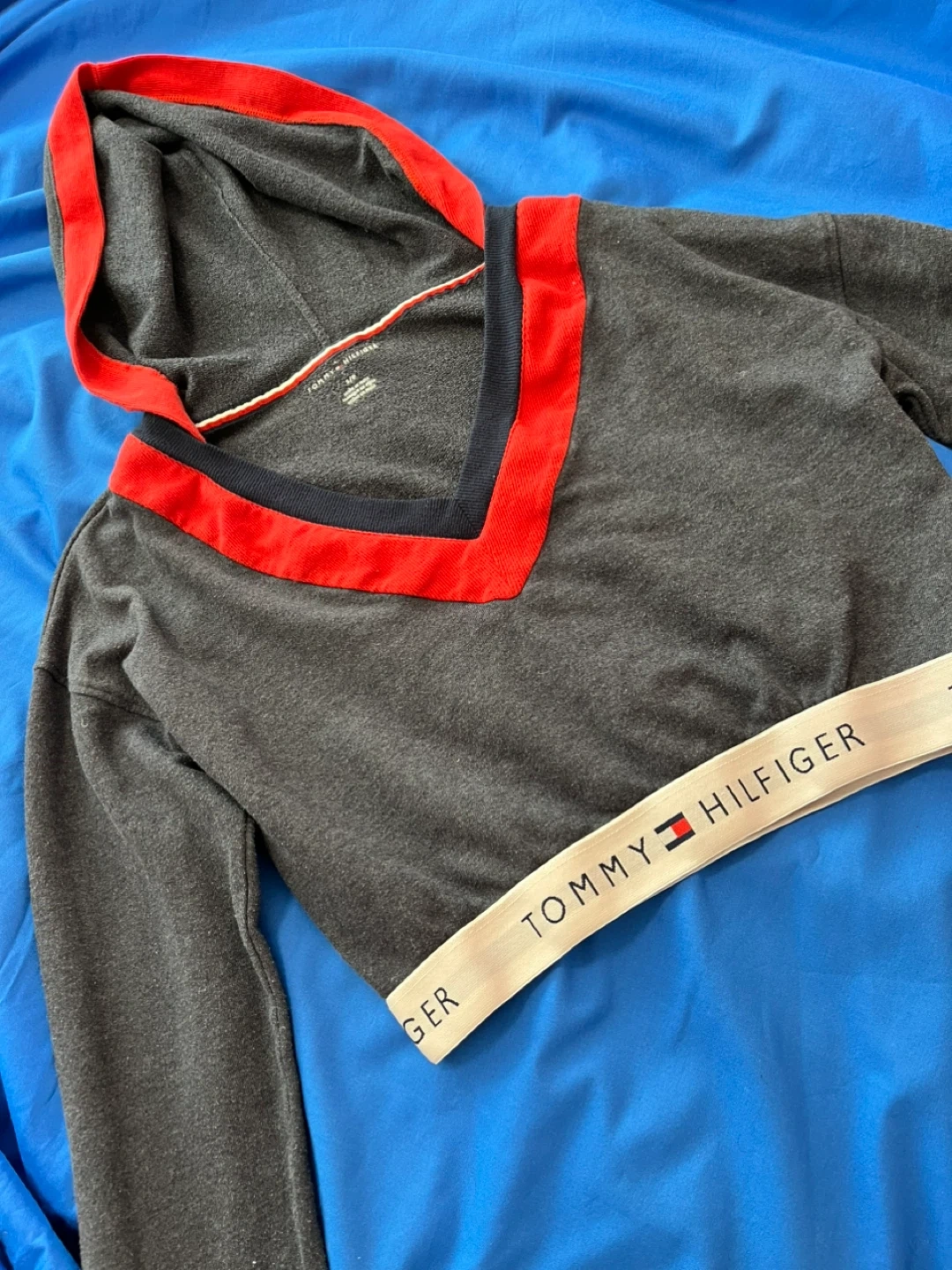 Tommy Hilfiger cropped hoodie in charcoal sort of navy blue . It features a red and navy trim around the V-neck and a branded elastic waistband. Size is xs . Great condition