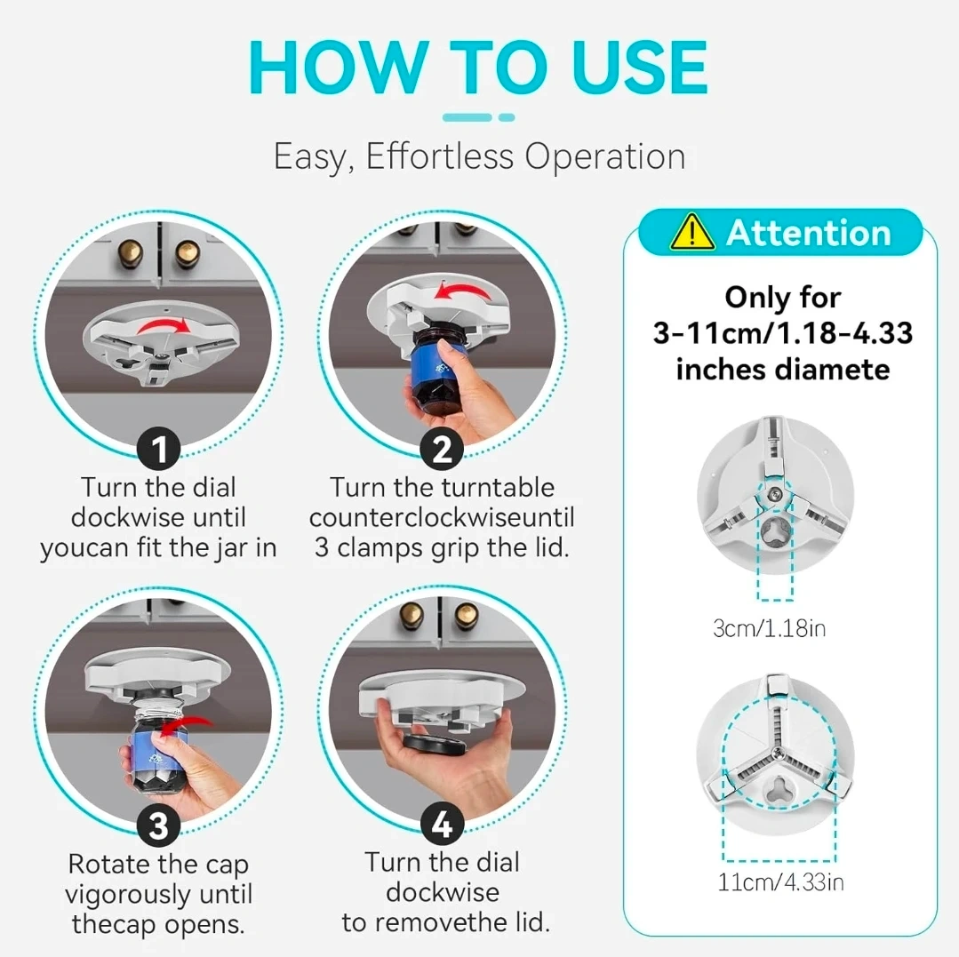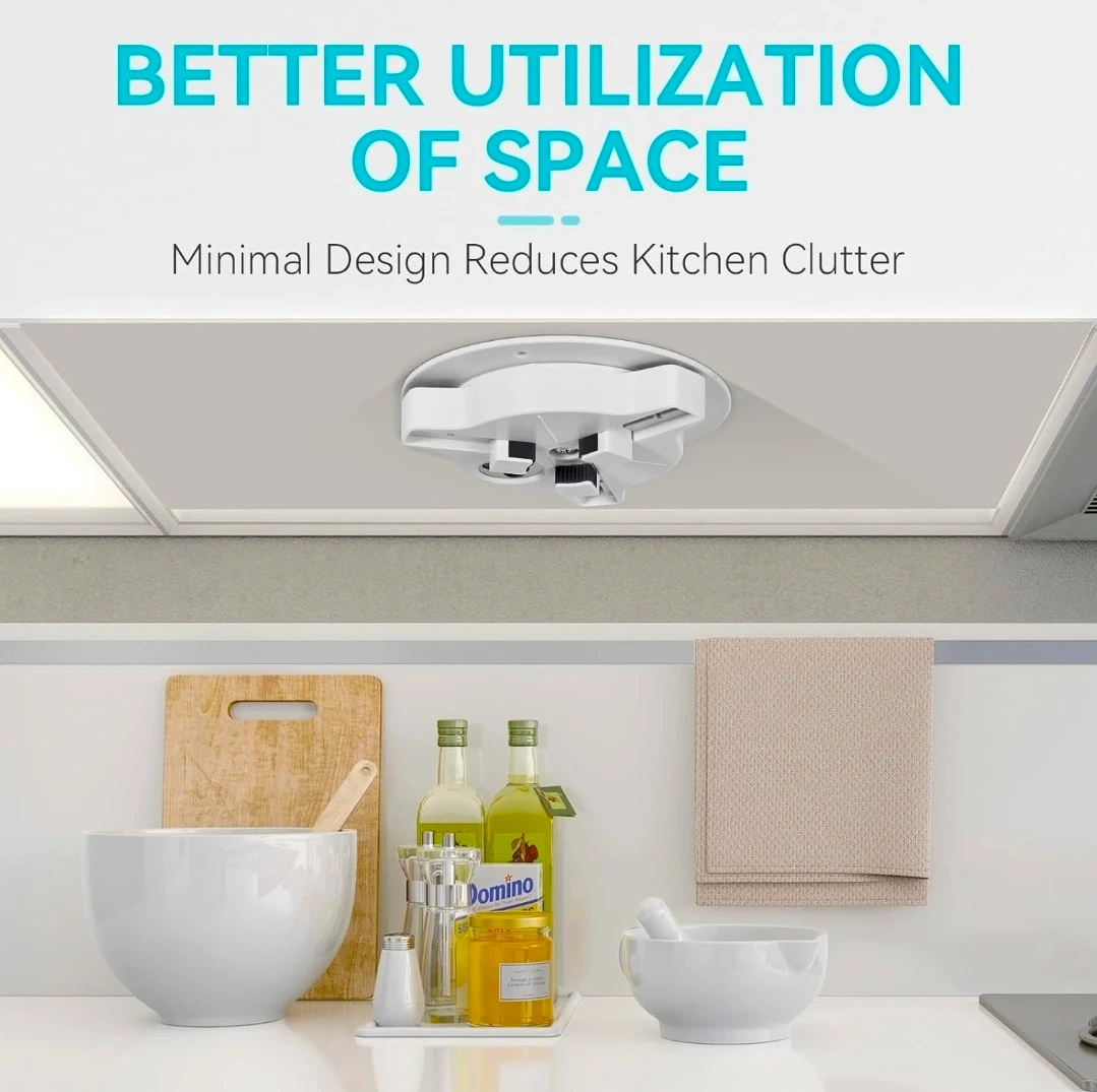 This multifunctional bottle opener easily opens jars and bottles, suitable for lids between 3-11cm in diameter. It features an under-cabinet design for convenient storage and use. Installation is simple with the included adhesive and screws.