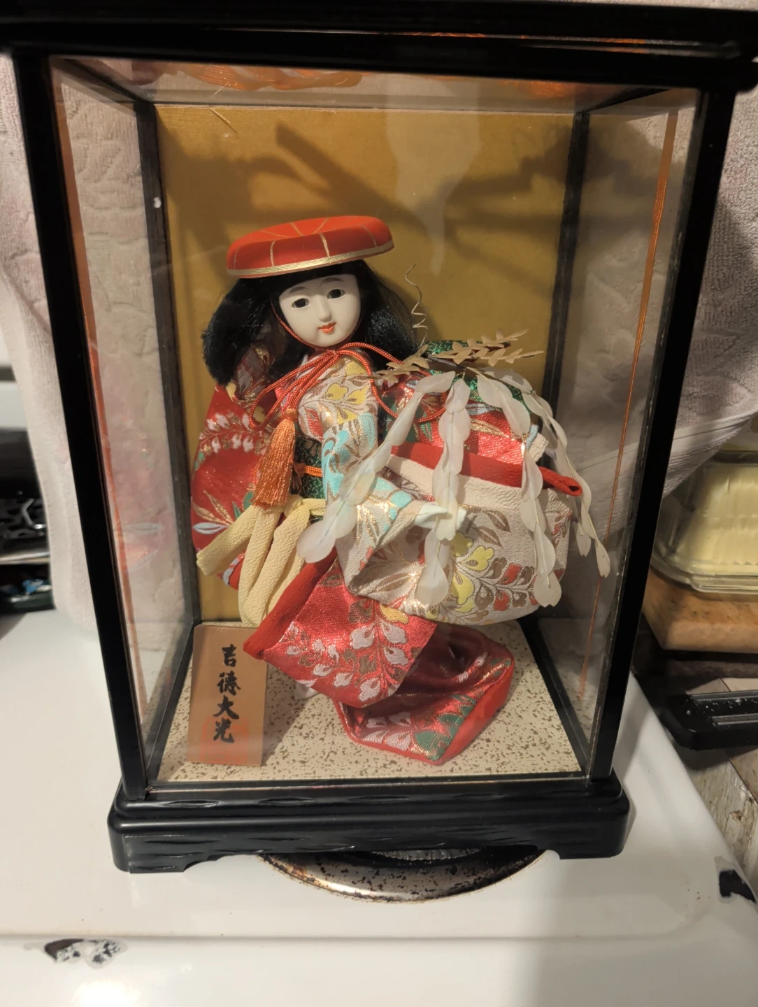 This is a traditional Japanese Kokeshi doll displayed in a protective case. The doll wears a colourful kimono and traditional hat. The case features a black base and frame.