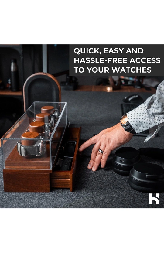 Redefining Your Watch Storage — Reach for all your watches and accessories in one place. This watch case combines an innovative acrylic cover to display your watches and a large drawer to hold your accessories. As you get ready for work, conveniently grab your watch and accessories for the day.