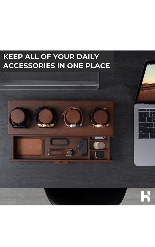 The Home for Your Favorite Watches — Your style will be on full display with this patented, eye-catching wooden mens watch box design which also makes a perfect gift. Rotate your watch collection on display on the four watch display pillars, with an additional drawer to store your other everyday carry items. Make a statement with this watch case.