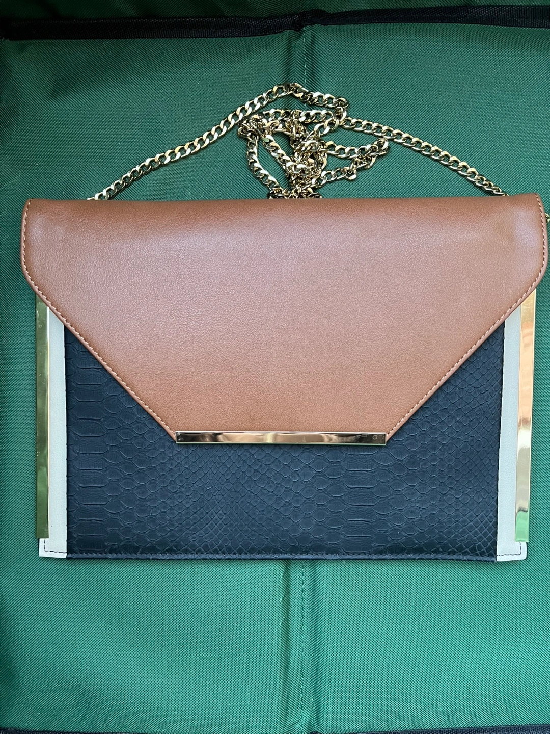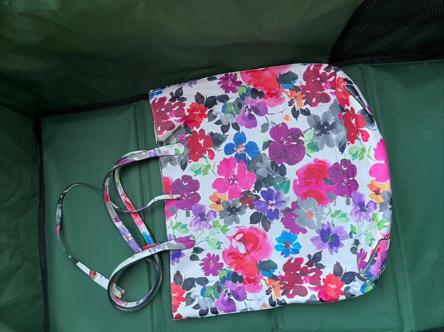 Set of four used handbags. Two are tote bags, one features a colourful patterned design and the other is a floral print. One is a black and brown envelope-style clutch with a gold chain strap (Aldo). The final bag is a smaller floral-printed case. All in good condition.