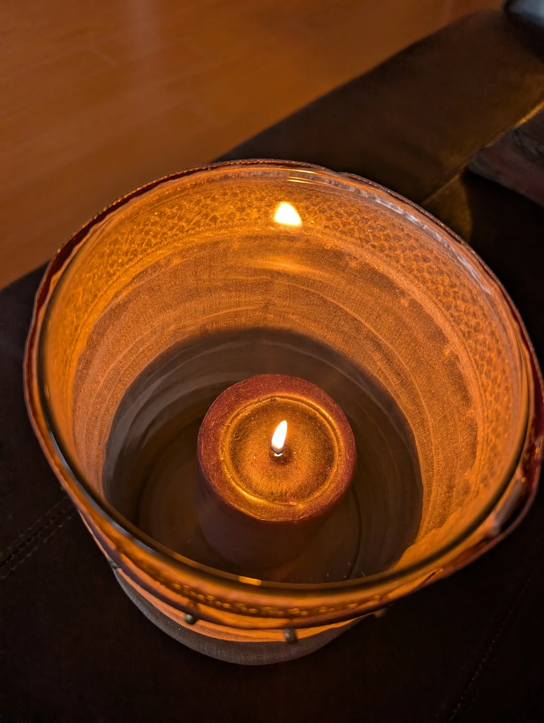 Pretty decorative lantern with a lit candle inside. It features ornate burgundy and gold trim at the top and bottom, with sheer fabric wrapped around the body. Tiny bells hang from the upper trim for a lovely touch. Adds a warm ambiance to any room!