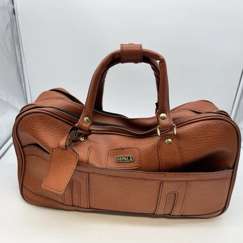 Authentic vintage Impala travel / duffel bag, dating to the late 1970s–early 1980s. Features classic construction, multiple zip compartments, and a rich brown leather exterior with brass-tone hardware. A great functional bag or collectible vintage luggage piece.