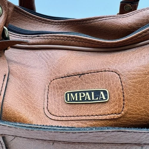 Authentic vintage Impala travel / duffel bag, dating to the late 1970s–early 1980s. Features classic construction, multiple zip compartments, and a rich brown leather exterior with brass-tone hardware. A great functional bag or collectible vintage luggage piece.