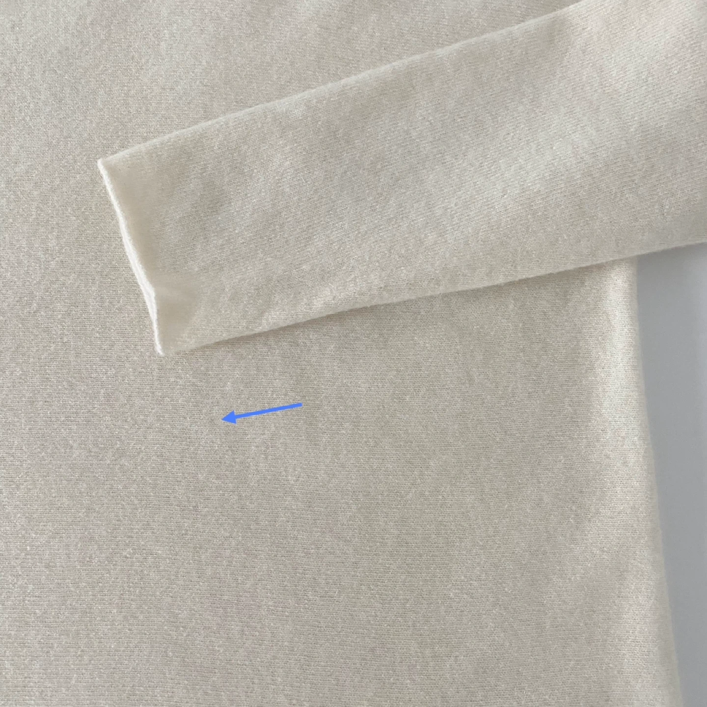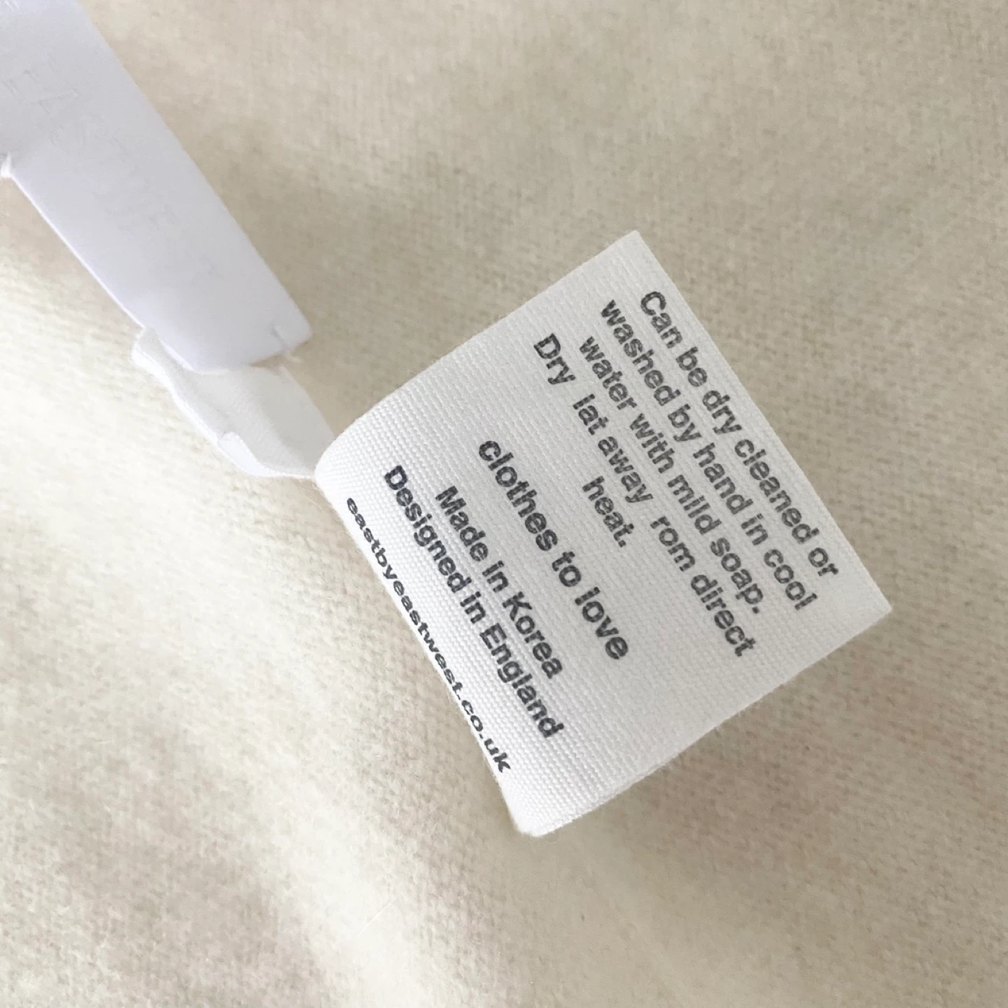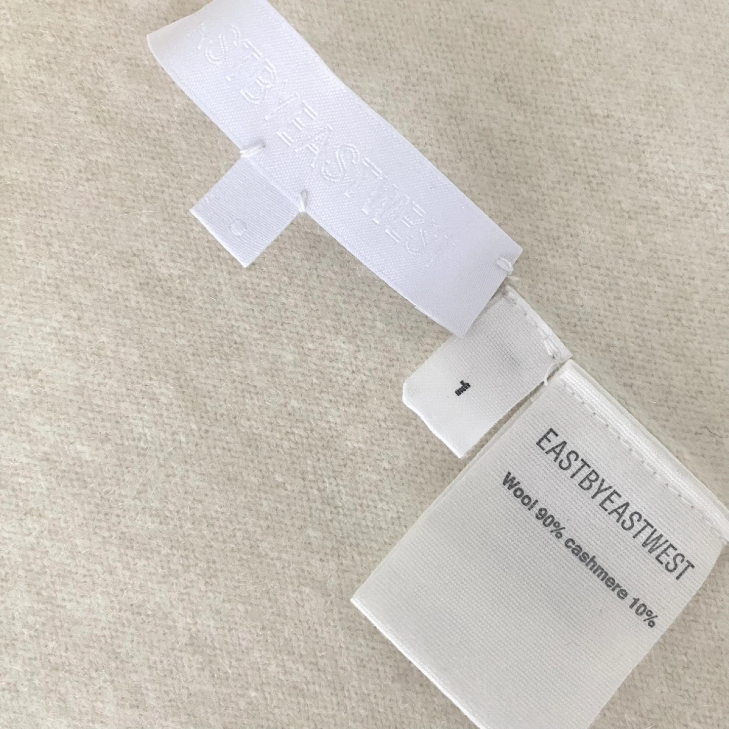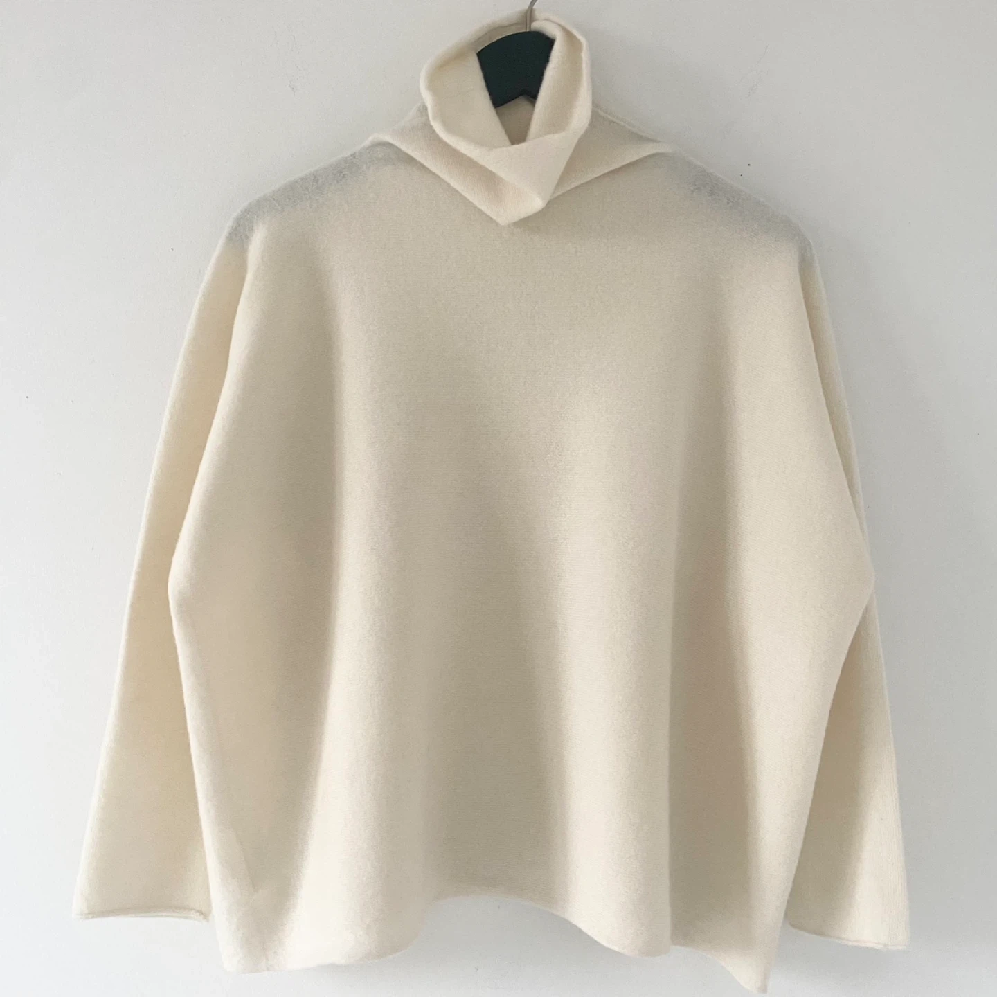 East By East West turtleneck sweater. Features a wider / boxy body with slim sleeves. Made of lightweight 90% wool and 10% cashmere in a cream colour. Incredibly well made - there are no arm holes and all seams are so tiny and flat, they are almost invisible as per the last pic. It's super soft, cozy and luxe. I don't find it itchy but it's subjective. There's a tiny faint mark (barely visible). Otherwise there's no pilling, snags or damage. It's clean and in excellent condition.