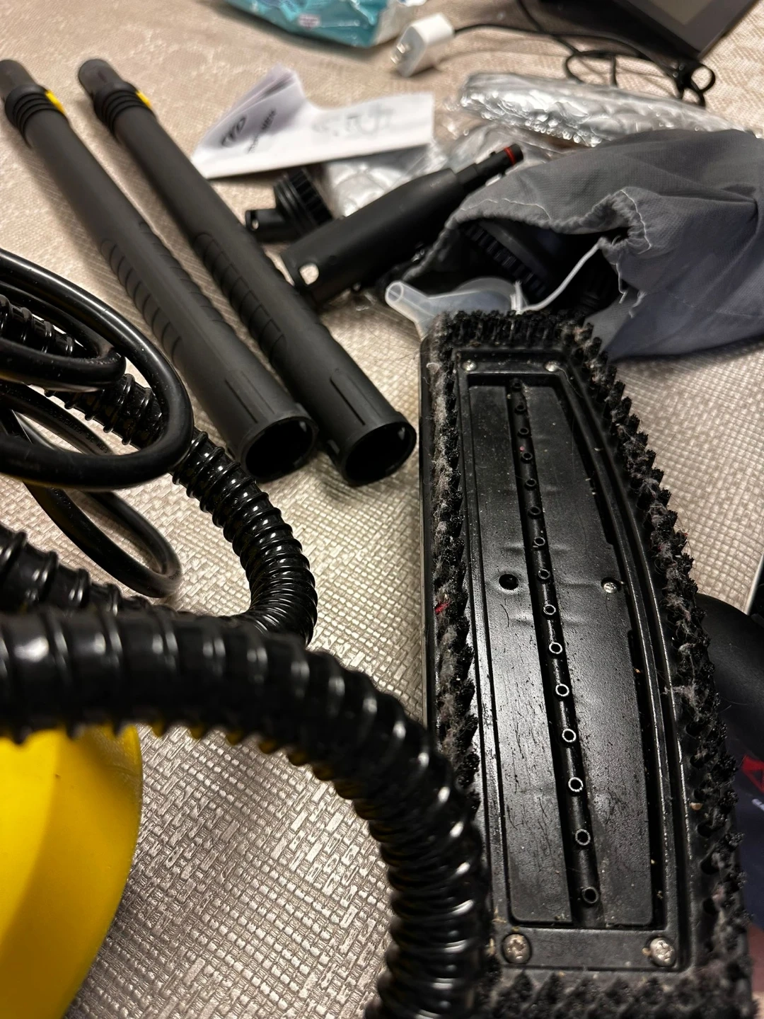 This portable steam cleaner comes with multiple attachments for various cleaning tasks. It features a bright yellow body and includes extension wands, a cleaning brush head, and a hose. It's ready to tackle tough grime!