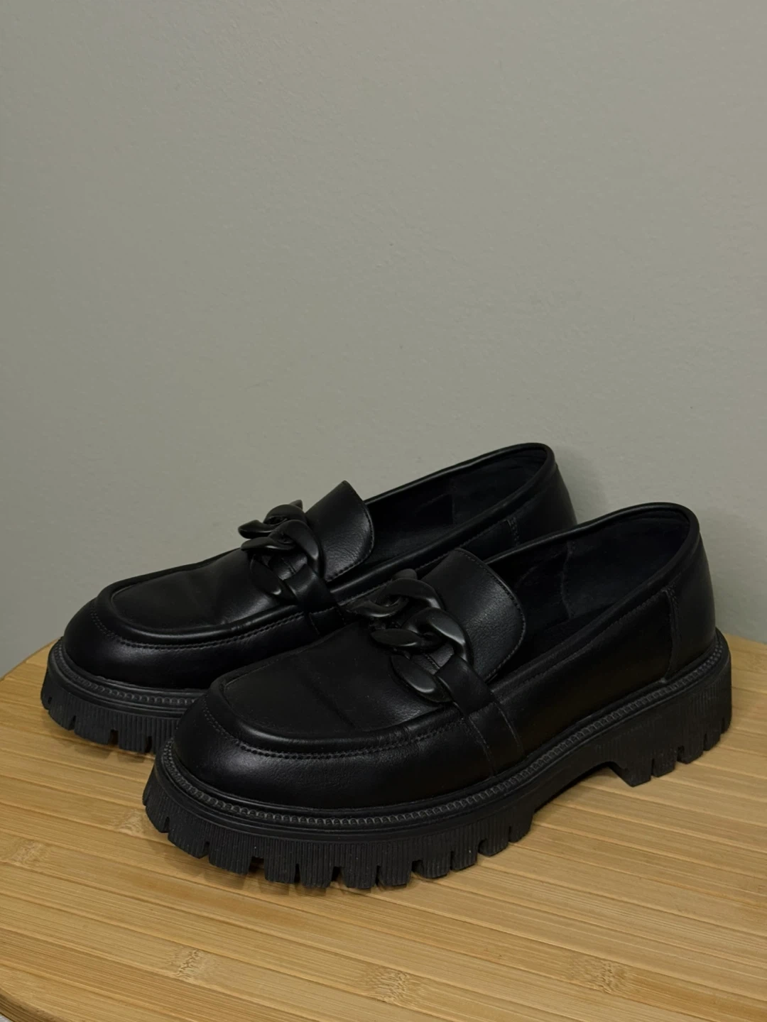 Selling a pair of stylish Patrizia black loafers. These have a chunky platform sole and a chain detail across the top. They're in great condition and are a size 39.