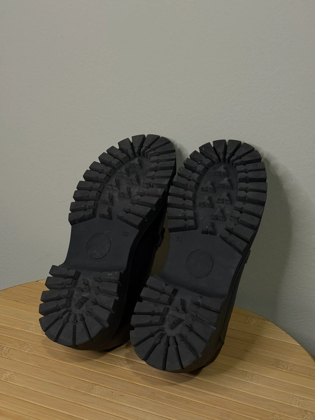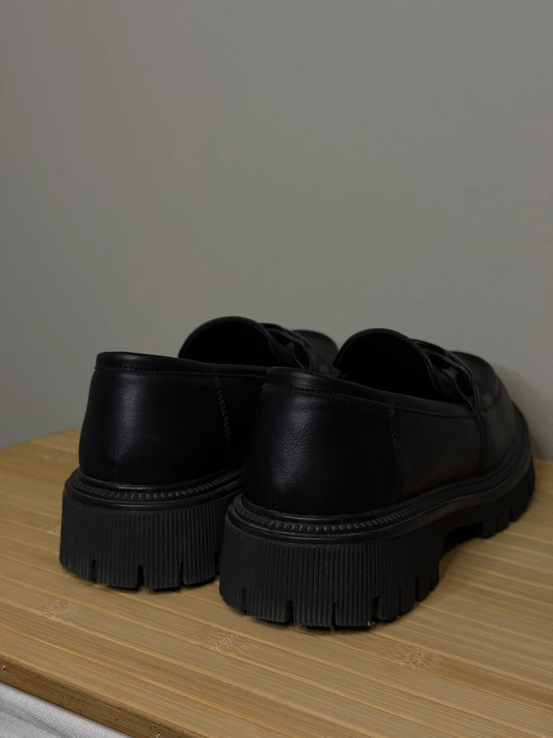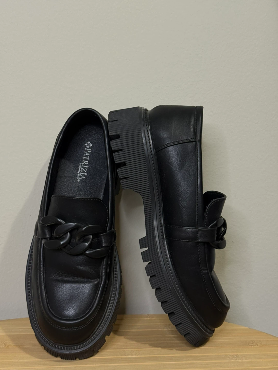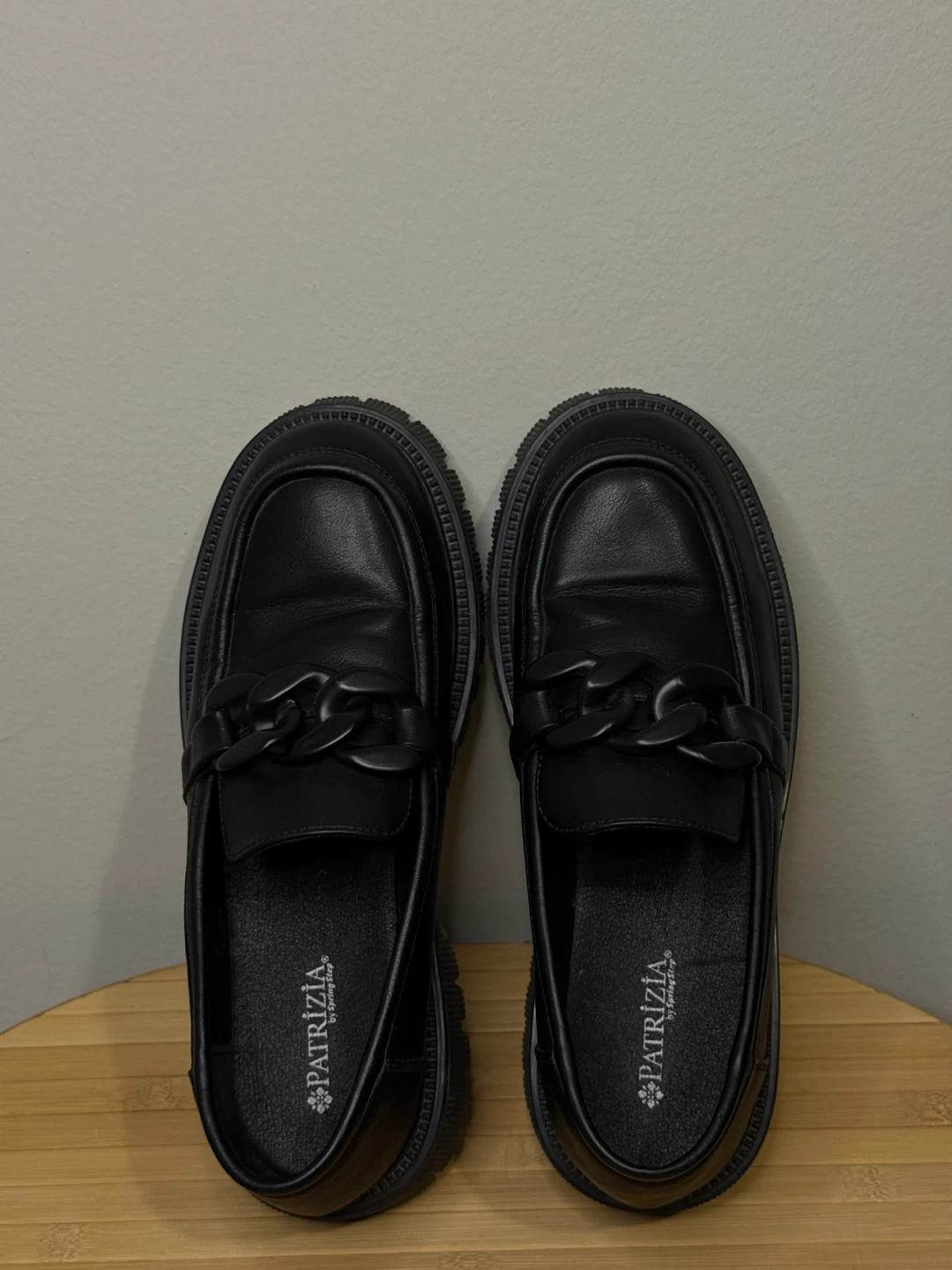 Selling a pair of stylish Patrizia black loafers. These have a chunky platform sole and a chain detail across the top. They're in great condition and are a size 39.