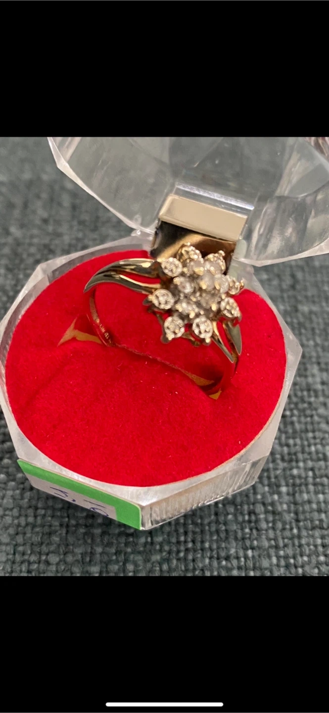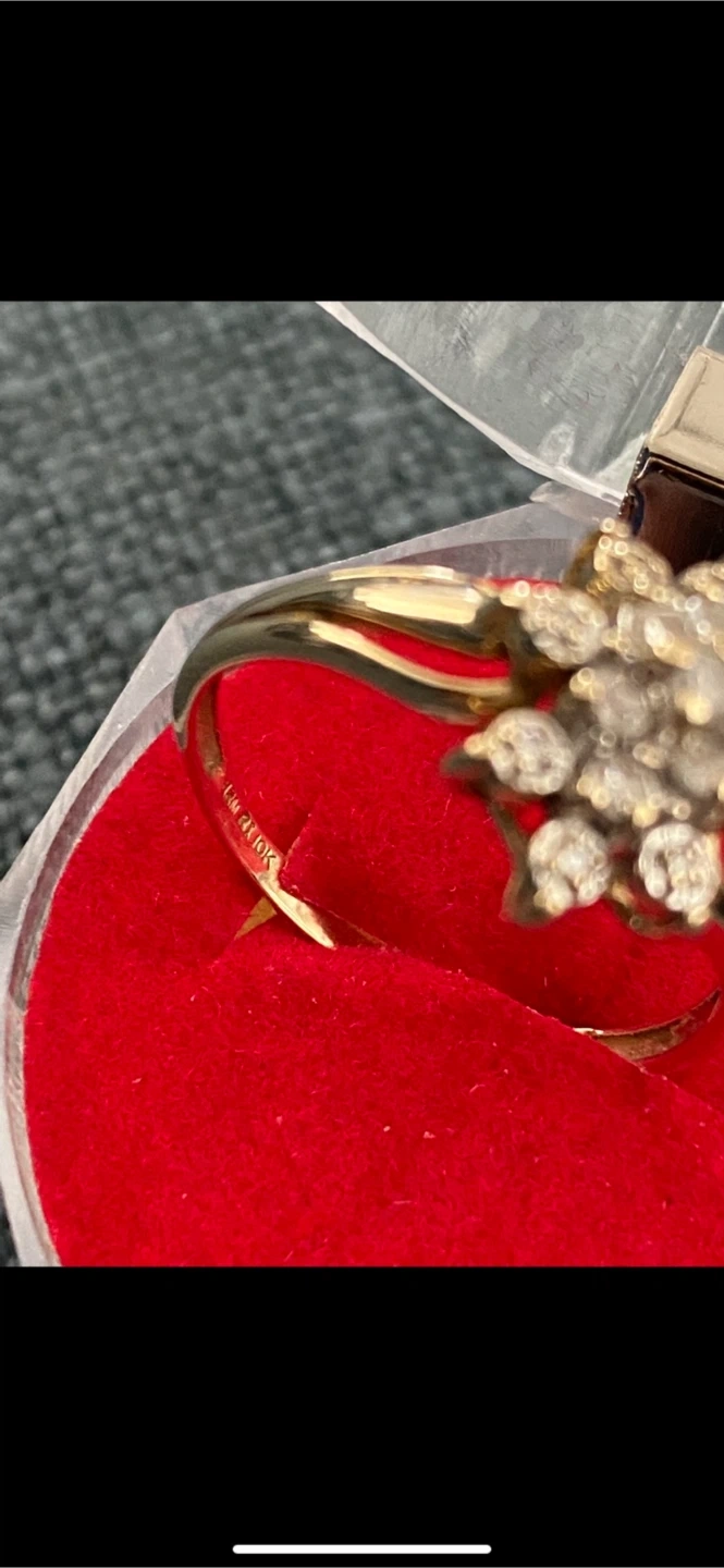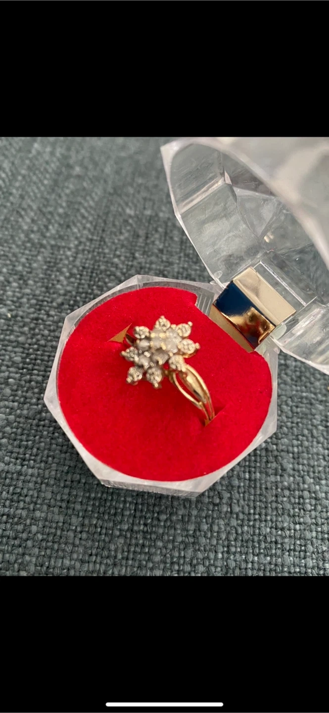 Selling a beautiful vintage ring featuring a 10kt gold band and a cluster of diamonds in a floral design. It comes in a red velvet display box, perfect for gifting or safekeeping. A timeless piece that would make a lovely addition to any jewellery collection!