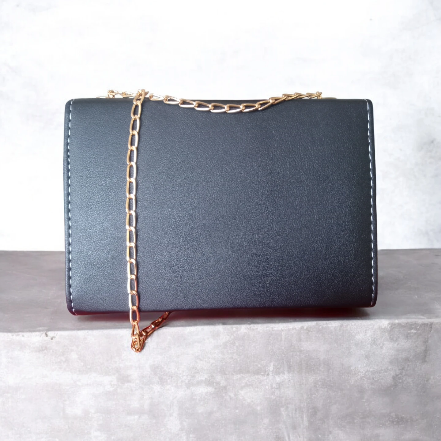 This stylish clutch features a black and white exterior with a glitter star pattern. It includes a detachable gold chain strap for versatile wear. The interior has a zippered pocket for secure storage.