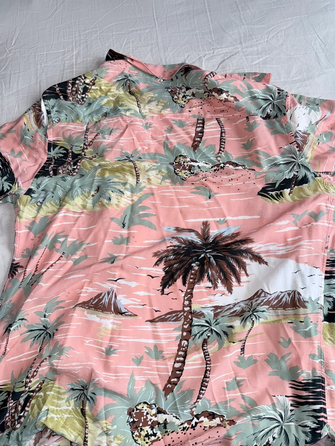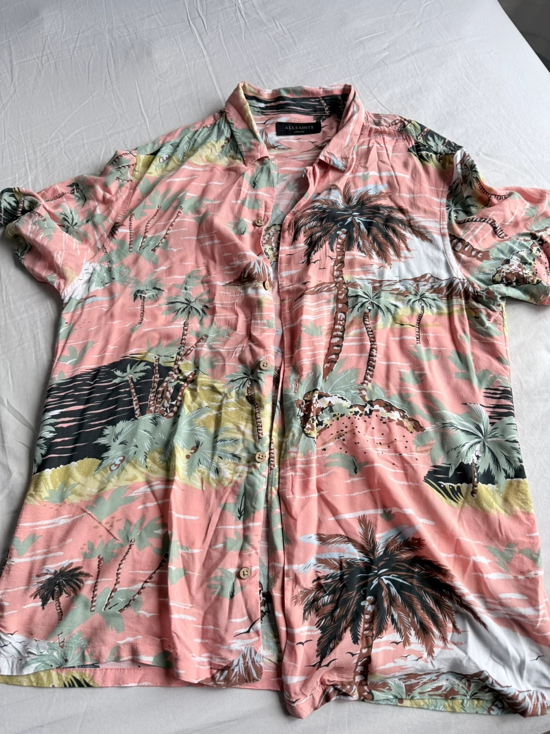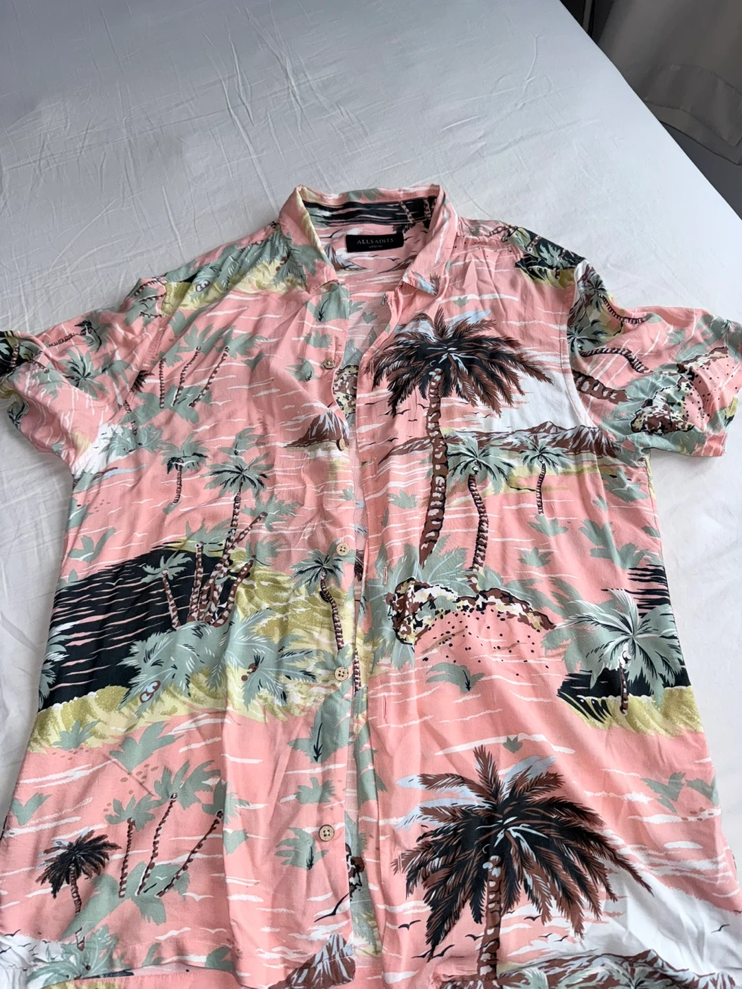 This is an AllSaints short-sleeved Hawaiian shirt. It's made with a colourful tropical print. Short sleeves are great for warm weather!
