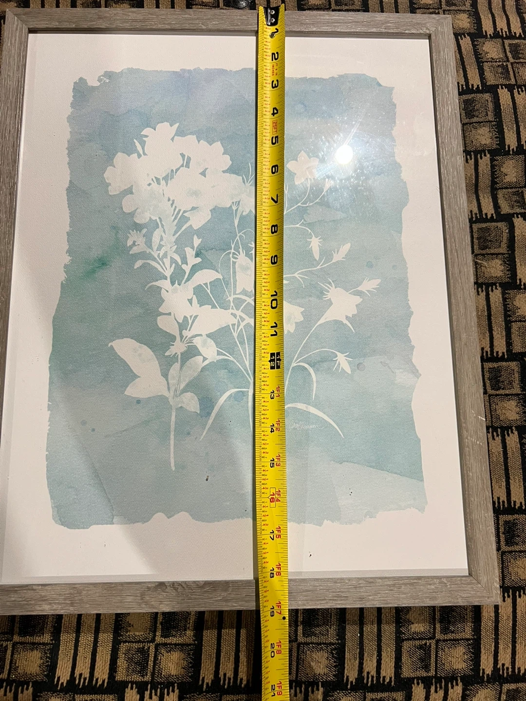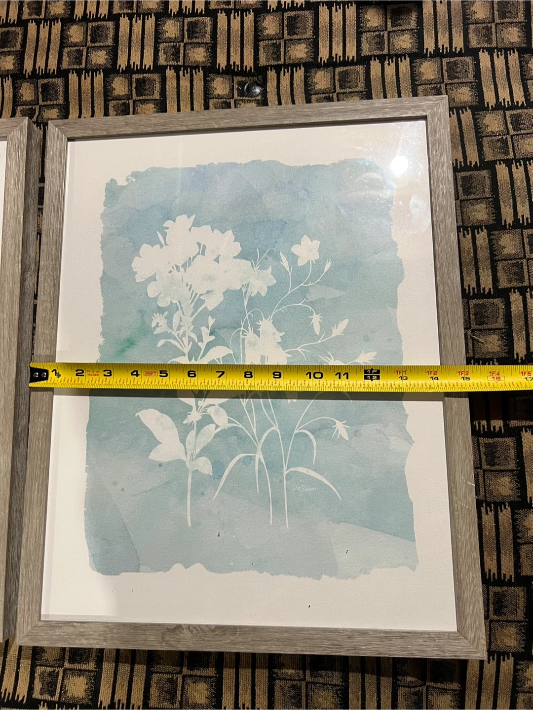 Set of two framed prints. Each print features a watercolor-style floral design, with the flowers outlined in white. The frames are a light grey wood.