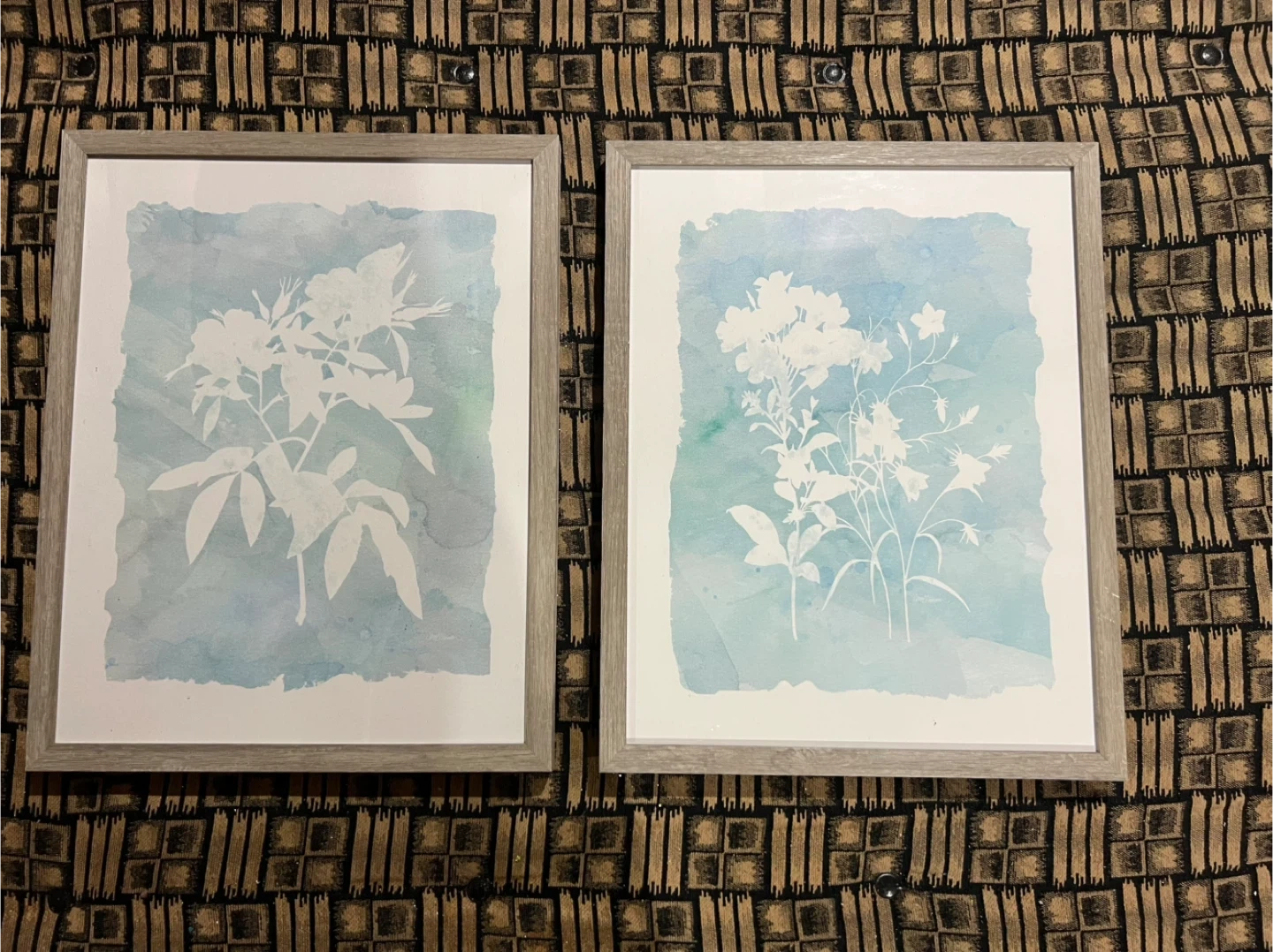 Set of two framed prints. Each print features a watercolor-style floral design, with the flowers outlined in white. The frames are a light grey wood.